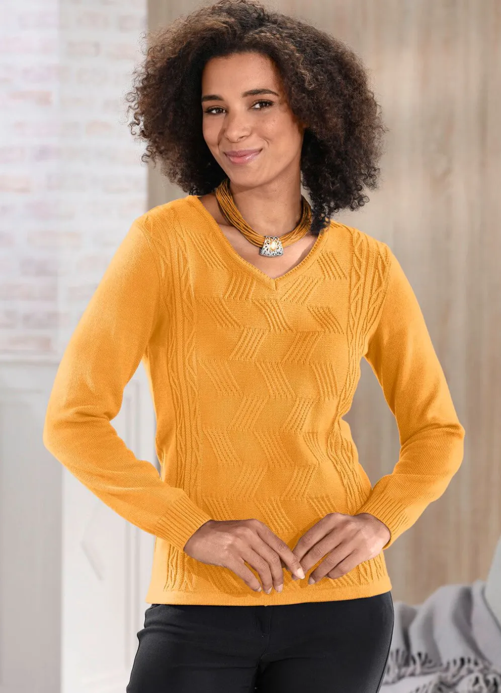 Unverzichtbar und super zu kombinieren ist dieser hübsche Pullover: V-Ausschnitt mit feinem Ajourdessin, streckender, aufwendiger Strukturmix im Vorderteil sowie lange Ärmel mit Rippenbündchen.