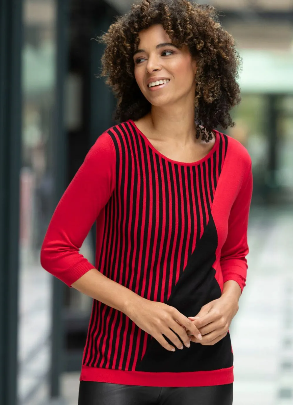 In weicher Qualität und mit dezentem Glanz zeigt sich dieser schöne Pullover in Rot-Schwarz, mit etwas weiterem, rundem Halsausschnitt, streckendem, grafischem Mustermix im Vorderteil sowie 3/4-langen Ärmeln.