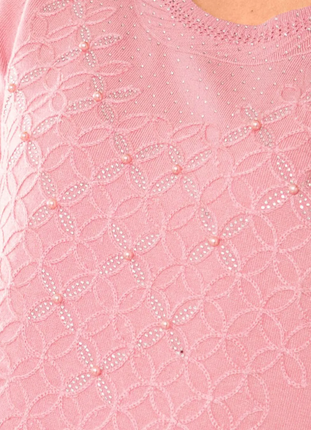 Ein elegantes Lieblingsstück ist dieser aufwendig gearbeitete Pullover in Rosé, mit Strukturmuster und Ajourakzenten am runden Halsausschnitt vorne, Stickerei, Perlen- und Strasszier im Vorderteil, Ärmeln in modischer Länge sowie leichtem Glanzeffekt.