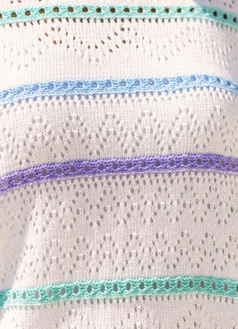 Bezaubernder Pullover in Ecru-Mint-Multicolor, mit Struktur-Ringeln und Ajour-Mustermix, silberfarbenen Glitzerakzenten allover, rundem Halsausschnitt, langen Ärmeln sowie Rippenbundabschlüssen.