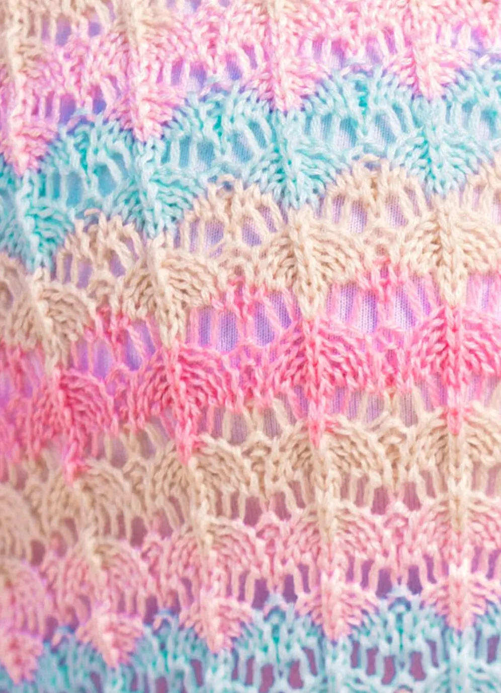 Ein pfiffiger Blickfang ist dieser Pullover in Rosé-Beige-Bleu: leicht transparente Strickart in Häkeloptik, runder Halsausschnitt, Ajourmuster im Streifendessin allover, überschnittene Schulterpartie, etwas weitere, lange Ärmel sowie Abschlüsse in Wellenoptik.