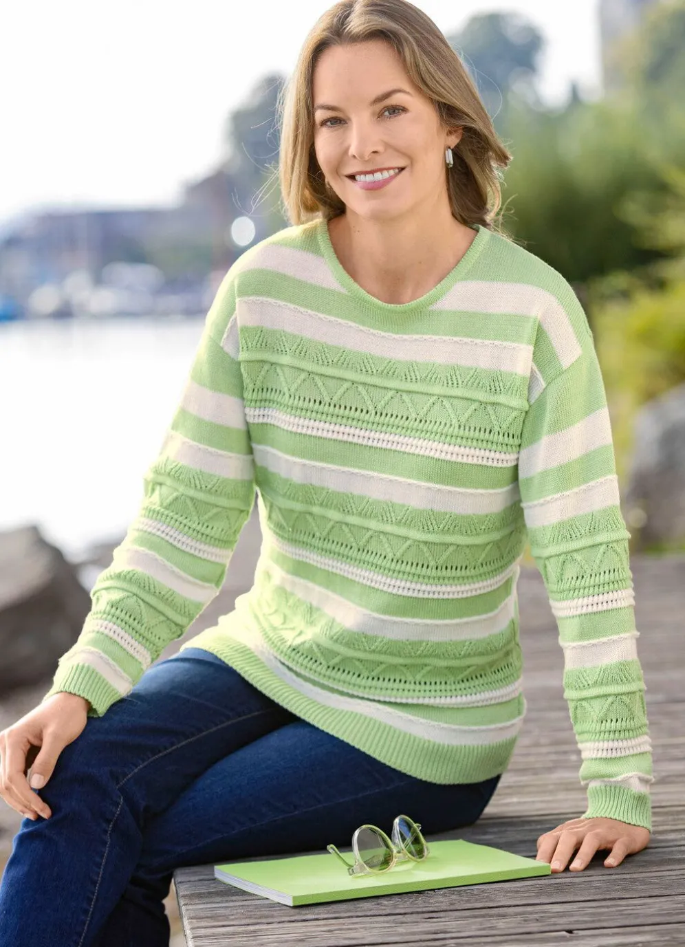 Ansprechender Pullover in Lindgrün-Weiß, mit rundem Halsausschnitt, Strukturmustermix mit Ajourdetails im Streifendessin rundum, überschnittener Schulterpartie sowie gerippten Abschlüssen an den langen Ärmeln und am Saum.