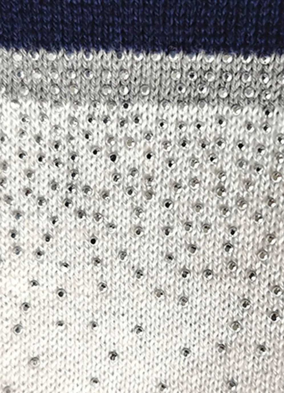 Hübscher Pullover in Marine-Ecru-Grau, mit rundem Halsausschnitt, Streifendessin allover, aufwendiger Steinchenzier im Vorderteil sowie langen Ärmeln.