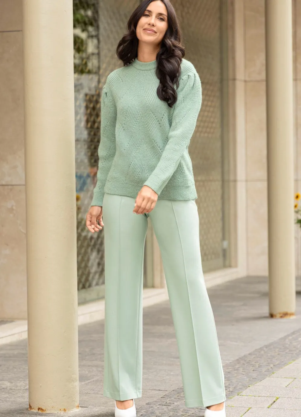 Extravaganter, mint melierter Pullover von TIZIA mit Stehbund, hübschem Strukturmuster im Perlfang mit dezentem Ajourmuster allover, langen Ärmeln mit dekorativer Faltenlegung an der überschnittenen Schulterpartie sowie gerippten Abschlüssen.
