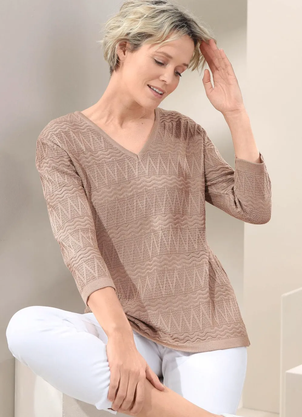 Umwerfender Pullover mit edlem, dezentem Glanz, streckendem V-Ausschnitt, Strukturmix allover, 3/4-langen Ärmeln sowie fein gerippten Abschlüssen.