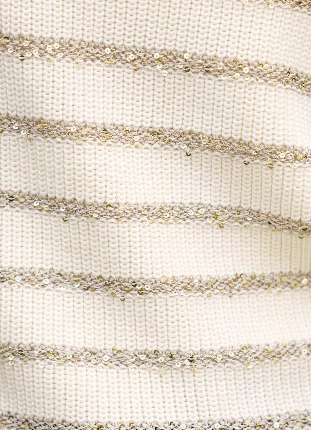 Pullover in Ecru-Silberfarben: runder Halsausschnitt, edles Streifenmuster mit hochwertigem Pailletten-Glanzgarn im Vorder- und Rückteil, lange Ärmel sowie gerippte Abschlüsse.