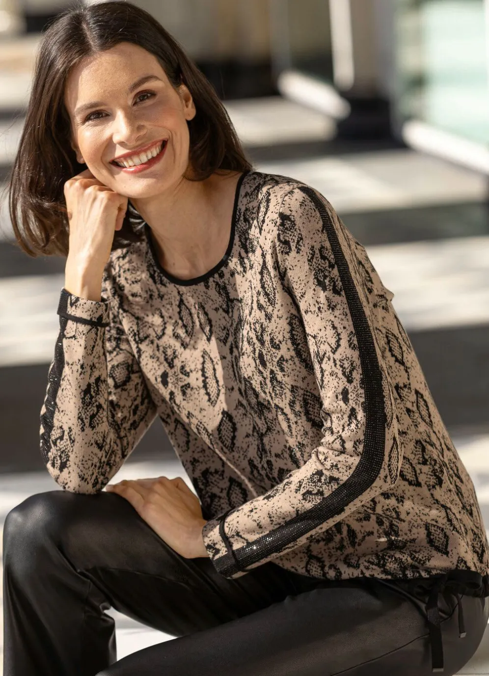 Ein Modell der Extraklasse ist dieser Pullover in Beige-Schwarz, mit rundem Halsausschnitt, Alloverdessin mit schwarzer Schmucksteinzier im Vorderteil, langen Ärmeln mit schmucksteinverziertem, schwarzem Besatz und Umschlag sowie Tunnelzug und Bindeband am Saum.