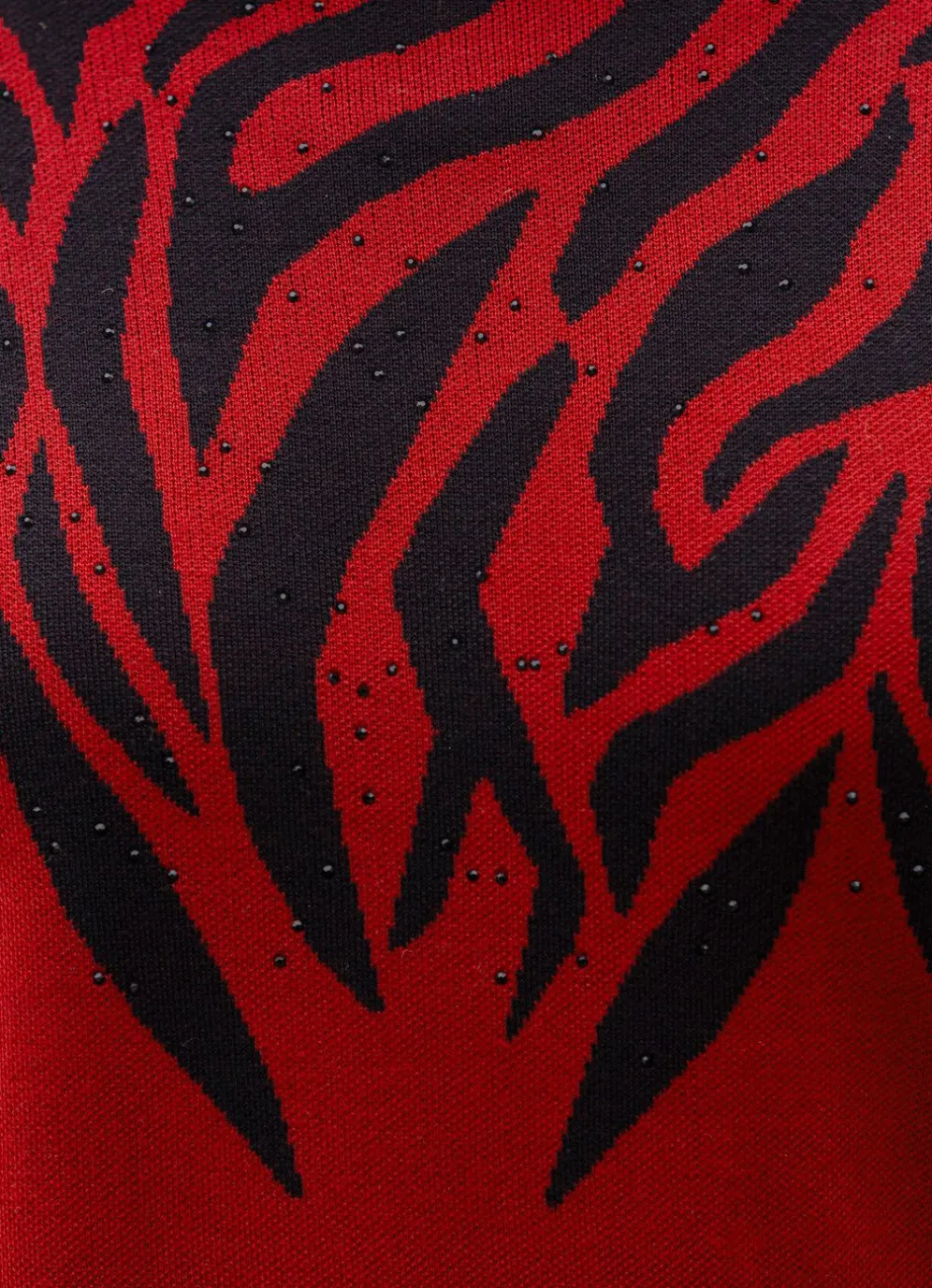 Extravaganter, rot-schwarzer Pullover in sehr weicher Qualität, mit rundem Halsausschnitt, streckendem, grafischem Muster mit schwarzer Strasszier im Vorderteil sowie langen Ärmeln.