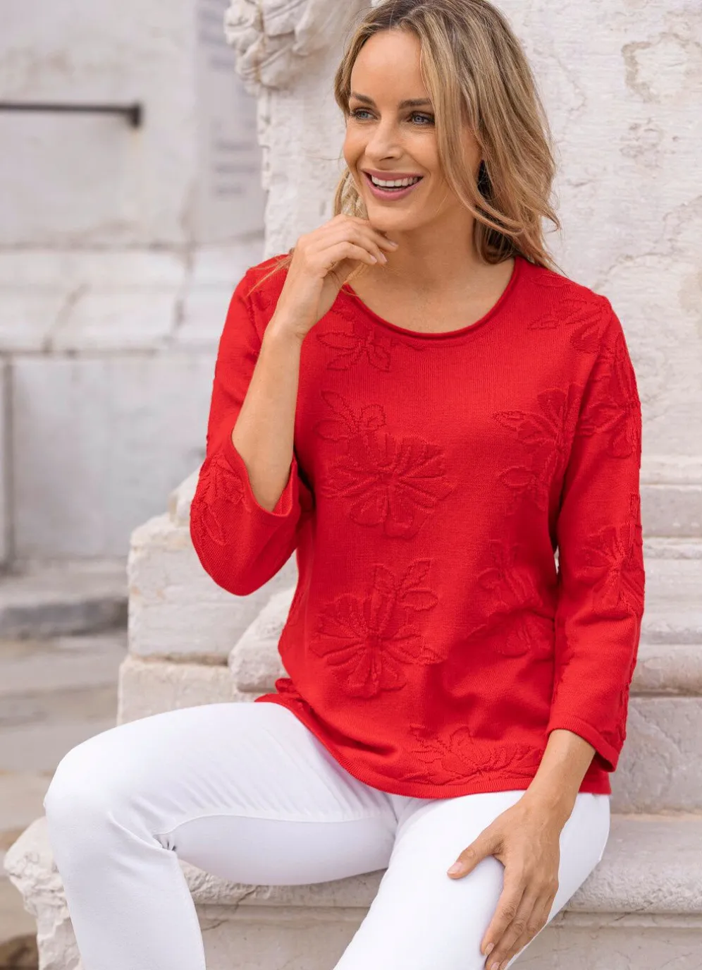 Roter Pullover mit dezentem, floralem Strukturstrick allover, rundem Halsausschnitt mit rolliertem Abschluss sowie 3/4-langen Ärmeln.