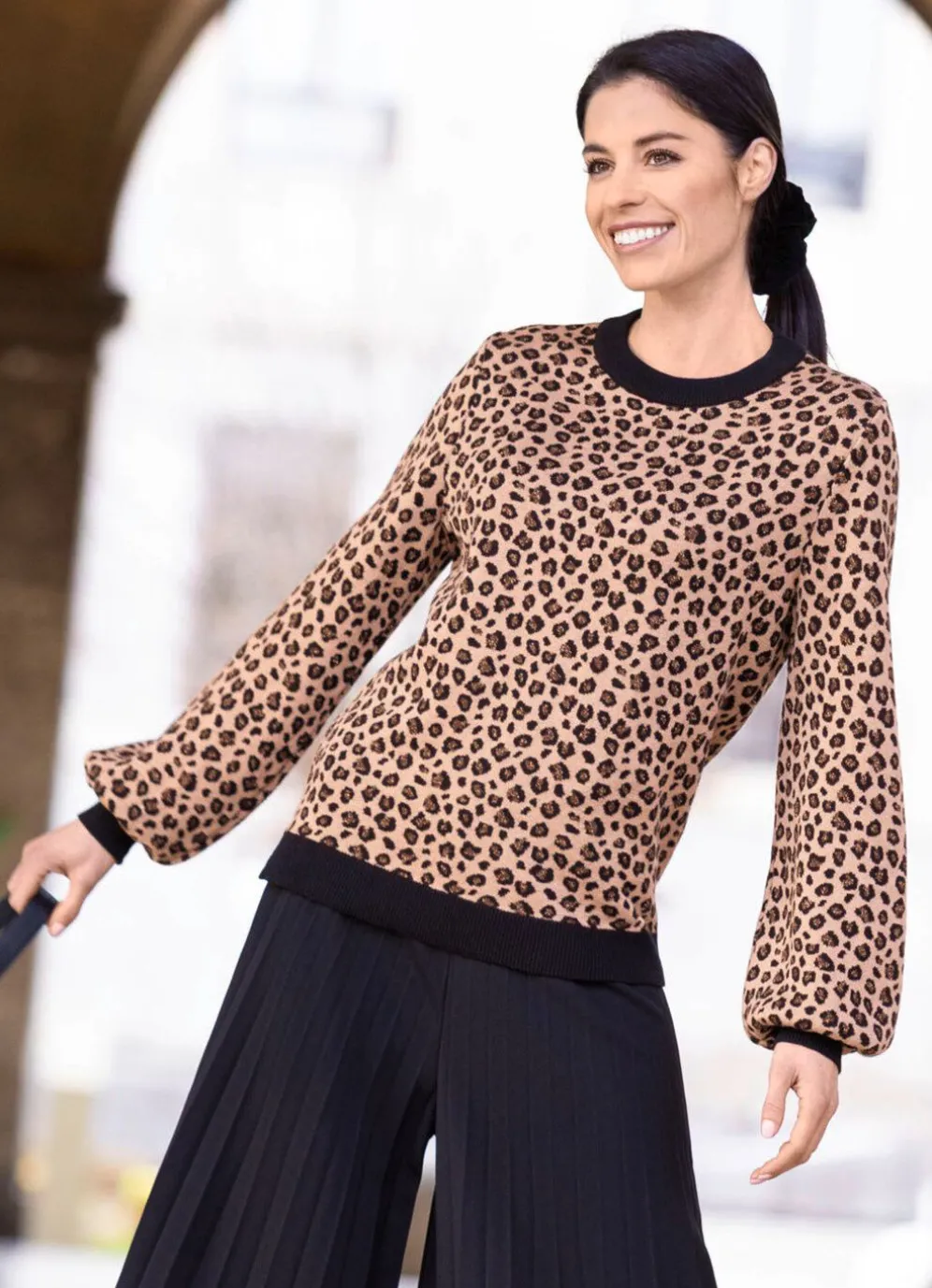 Eleganter Pullover in Camel-Schwarz-Braun mit rundem Halsausschnitt, Tierfelldessin mit goldfarbenen Glitzerakzenten allover, langen Ärmeln in leichter Ballonform sowie gerippten Kontrastabschlüssen.