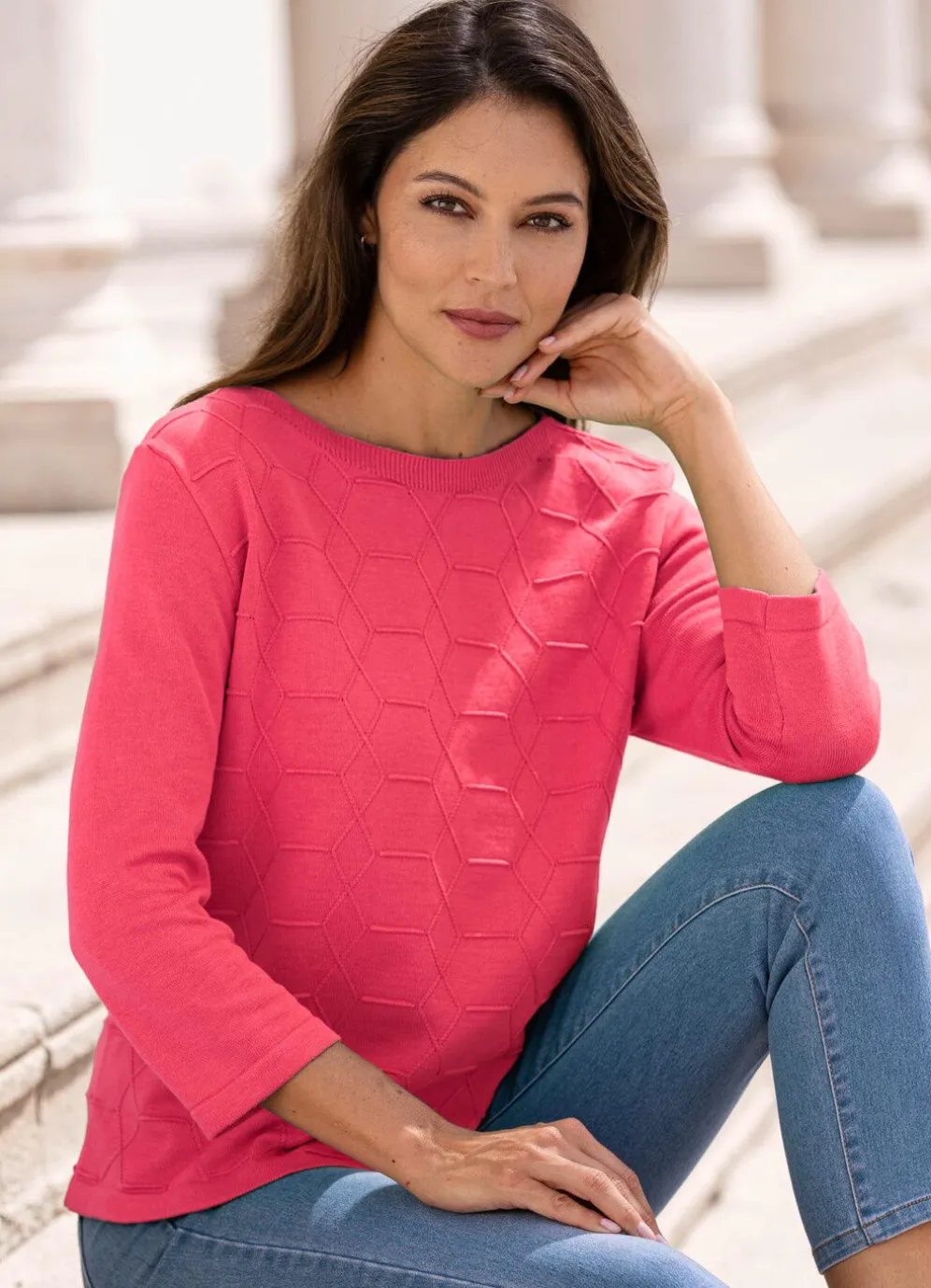 Ansprechender Pullover mit grafischem Strukturmuster im Vorder- und Rückteil, Rippenbündchen am runden Halsausschnitt sowie 3/4-langen Ärmeln.