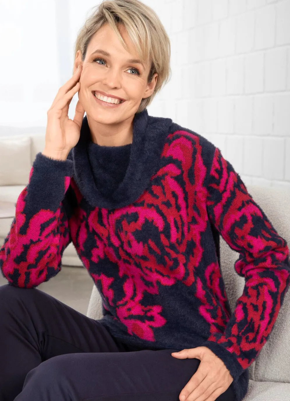 Dieser Pullover ist ein absolutes MUSS! Mit haarigem Effektgarn, legerem Rollkragen, aufwendigem Jacquardmuster allover sowie langen Ärmeln.