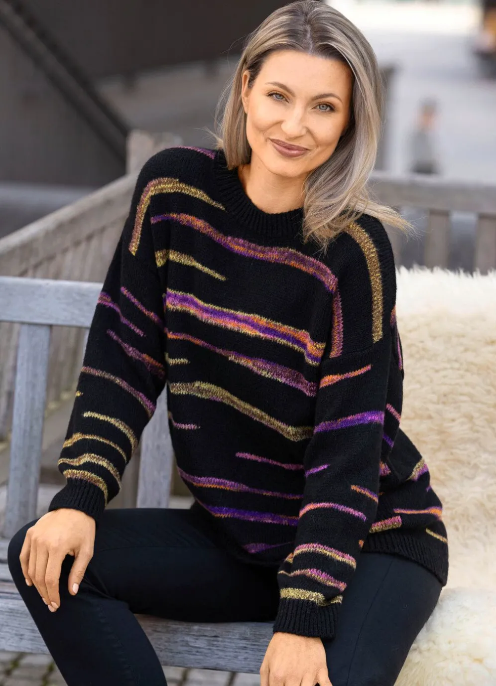 Jedes Teil ein Unikat! Pullover in Schwarz-Multicolor, mit rundem Halsausschnitt, Intarsien in farbenfrohem Streifendessin und Melangeoptik, überschnittener Schulterpartie, langen Ärmeln sowie gerippten Abschlüssen.