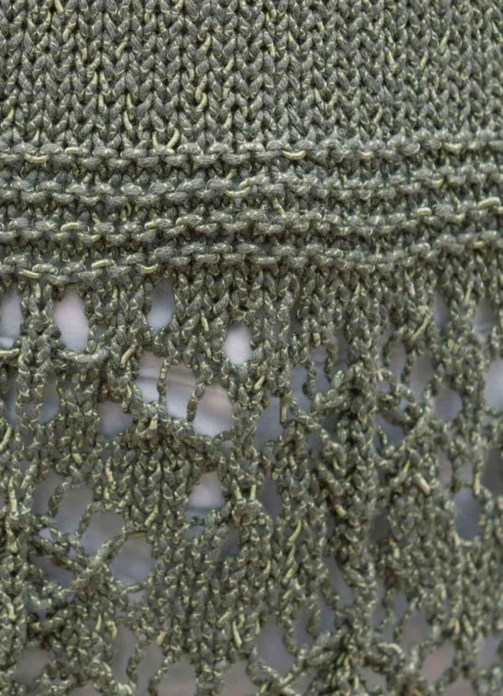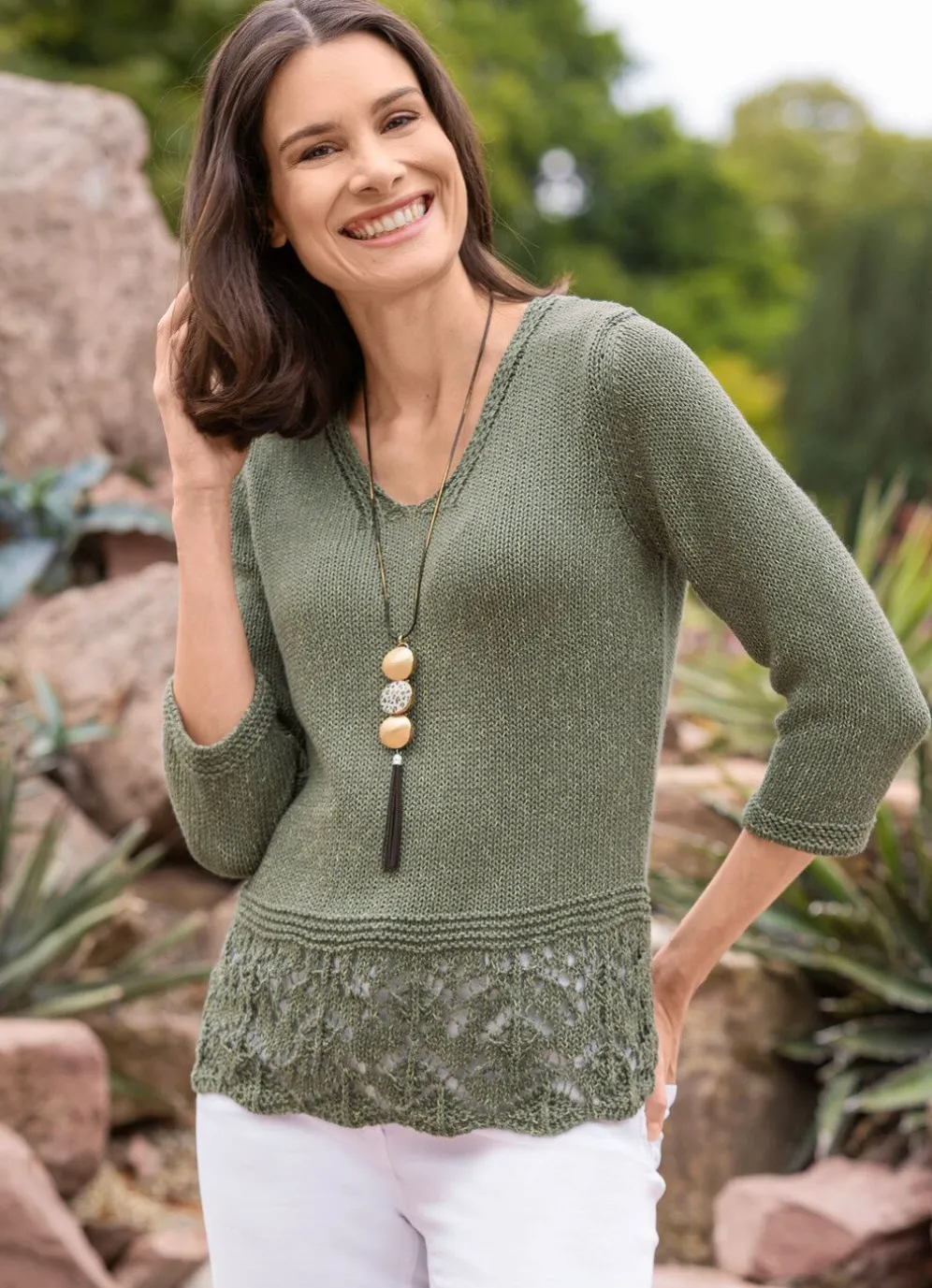Ein Liebhaberstück in faszinierender Modemasche ist dieser Pullover in Oliv meliert, mit V-Ausschnitt, dezentem Melange-Effekt durch edles Glanzgarn, 3/4-langen Ärmeln mit Biesenabschluss sowie dekorativem, gewelltem Saumabschluss im Ajourdessin in Bordürenoptik rundum.