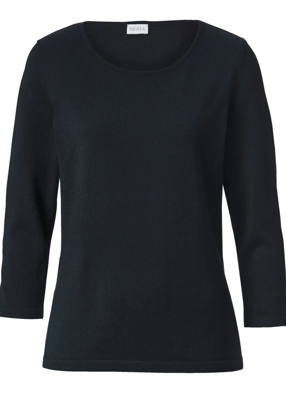 Pullover: Rundhals, 3/4-lange Ärmel, leicht tailliert, weich fließend.