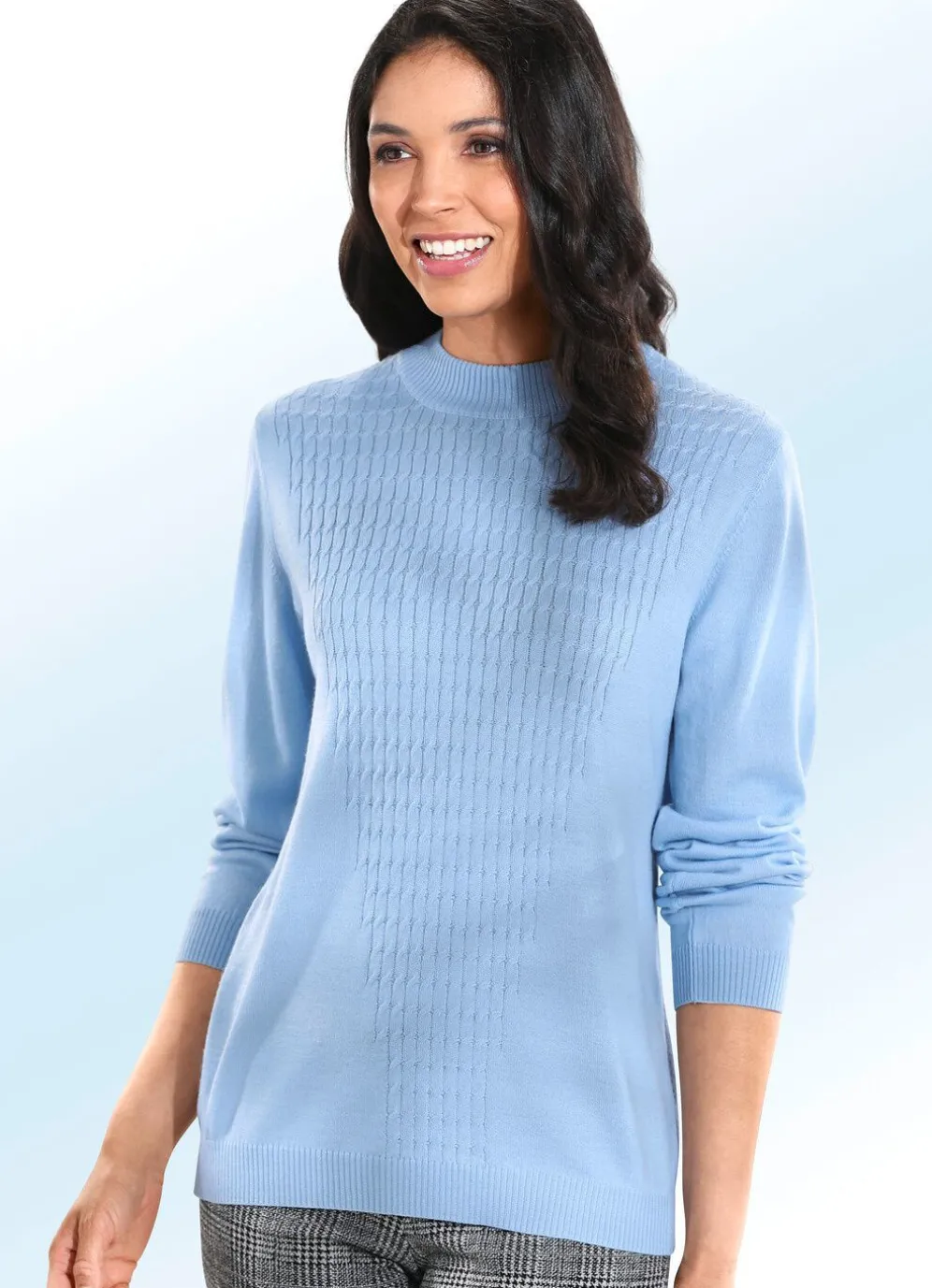 Bezaubernder Pullover mit Stehkragen, V-förmig angeordnetem Zopfmuster im Vorderteil sowie Rippenbundabschlüssen an den langen Ärmeln und am Saum.
