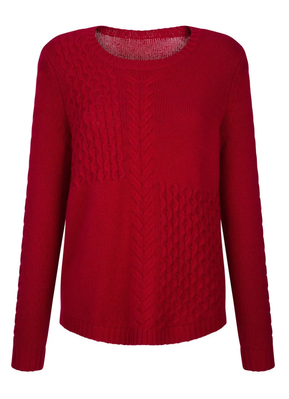 Pullover: runder Halsausschnitt, Rippenabschlüsse, Vorderteil im gepatchtem Strukturmix, Zopfstreifen auf den langen Ärmeln.