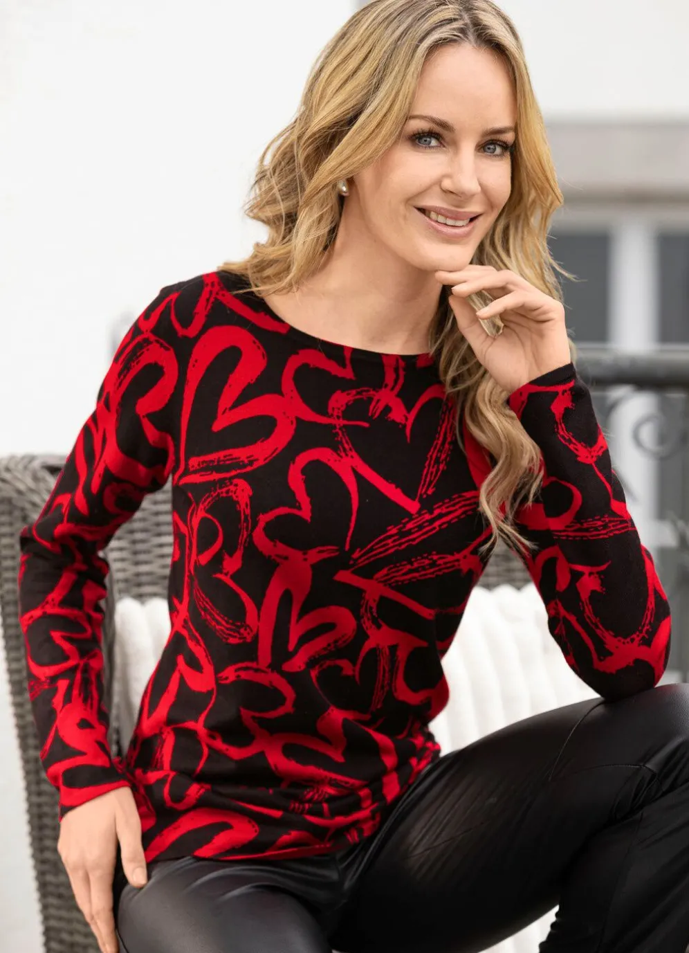 Jedes Teil ein Unikat! Fantasievoller, schwarz-roter Pullover mit interessantem Alloverdruck, rundem Halsausschnitt sowie langen Ärmeln.