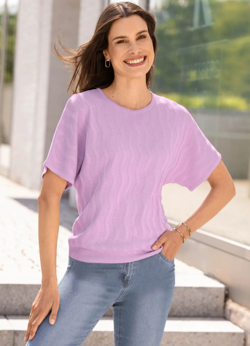 Pullover mit rundem Halsausschnitt, Strukturstrick in streckender Wellenoptik, kurzen Fledermausärmeln sowie geripptem Saumabschluss.
