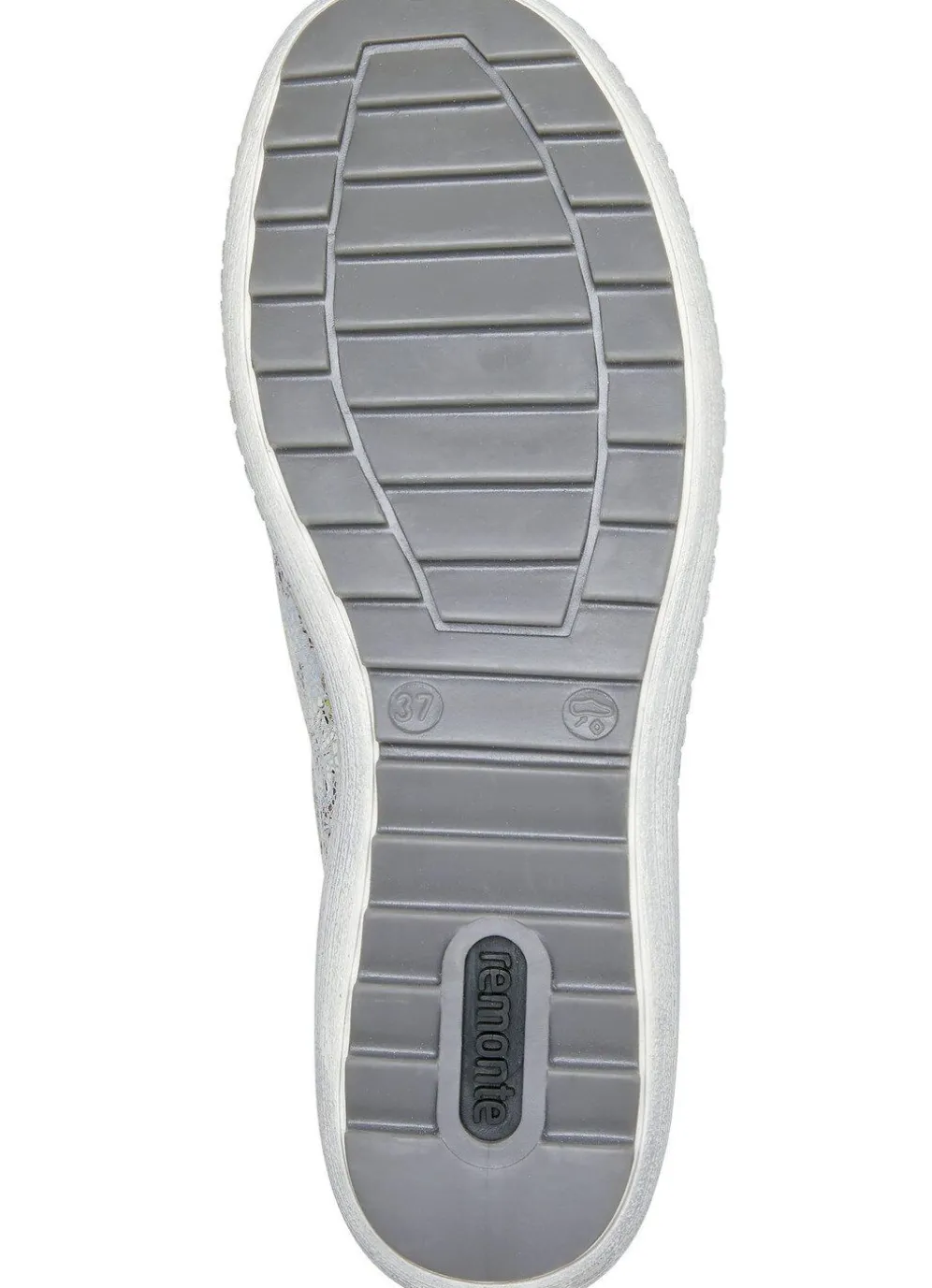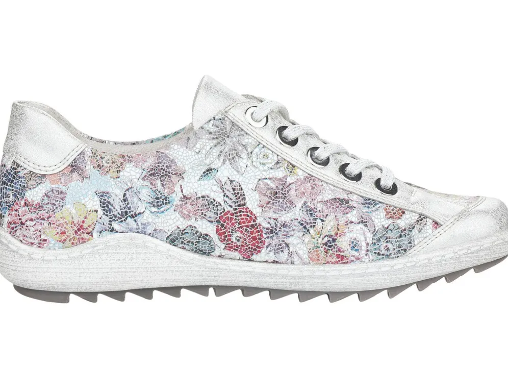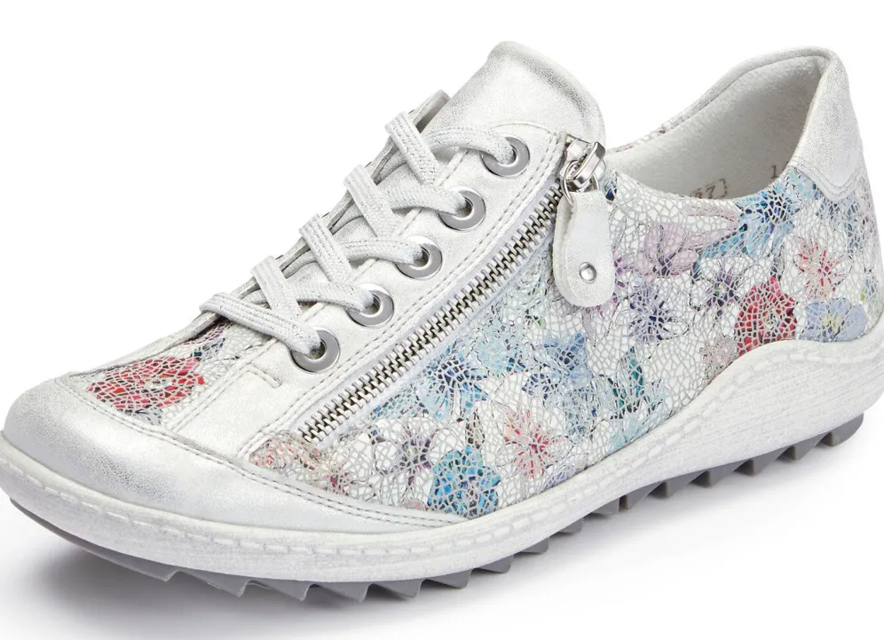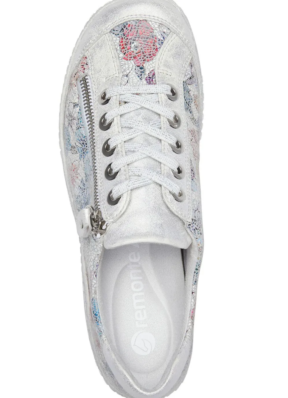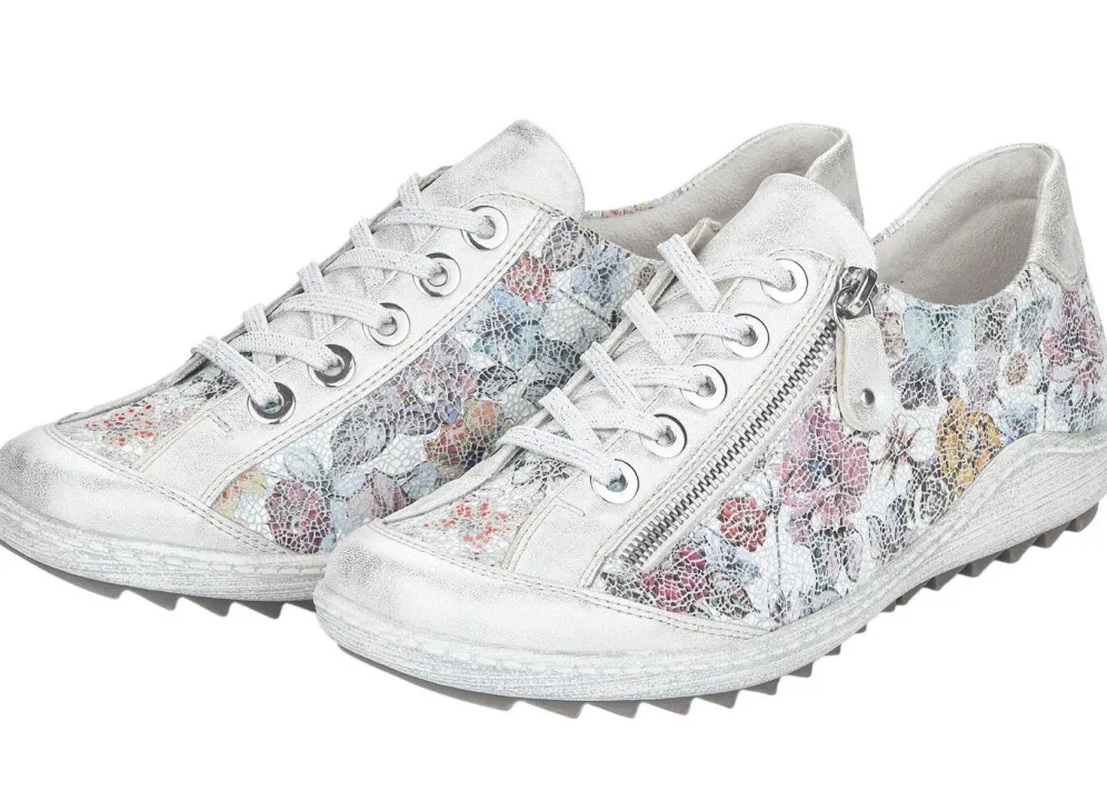 Sneaker in Silber-Bunt, aus floral geprägtem Leder und Synthetikmaterial, mit Schnürung und seitlichem Reißverschluss: Weite G, Futter, herausnehmbare Einlage, TR-Profilsohle sowie 15 mm Keilabsatz