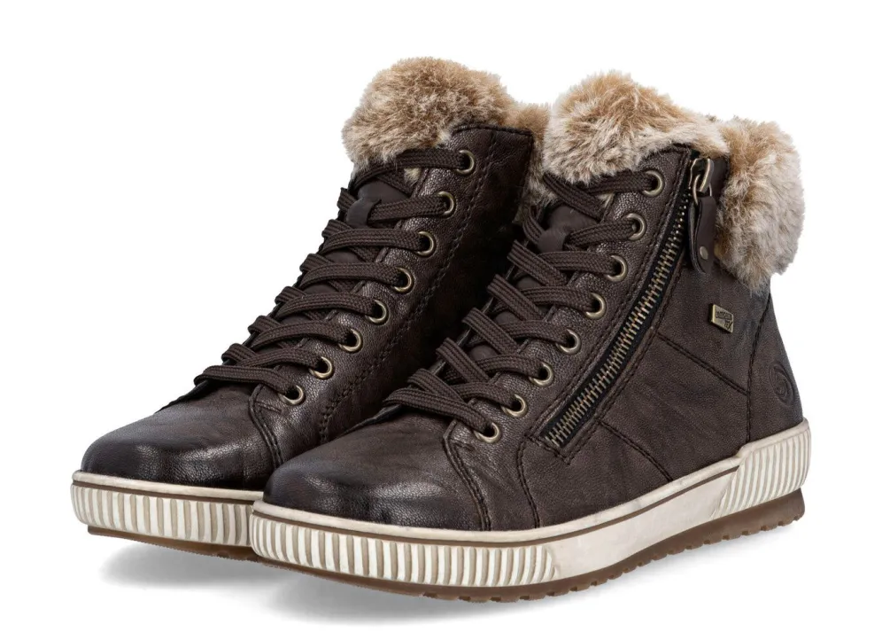 Boots aus Nappaleder mit dezenter Knitter-Struktur und meliertem Plüsch-Kragen: Weite G, Schnürung, seitlicher Reißverschluss, mit Klimamembrane ausgestattet, Warmfutter aus Lammwolle, herausnehmbares Fußbett, leichte TR-Profilsohle sowie 15 mm Keilabsatz. Schafthöhe ca. 9 cm