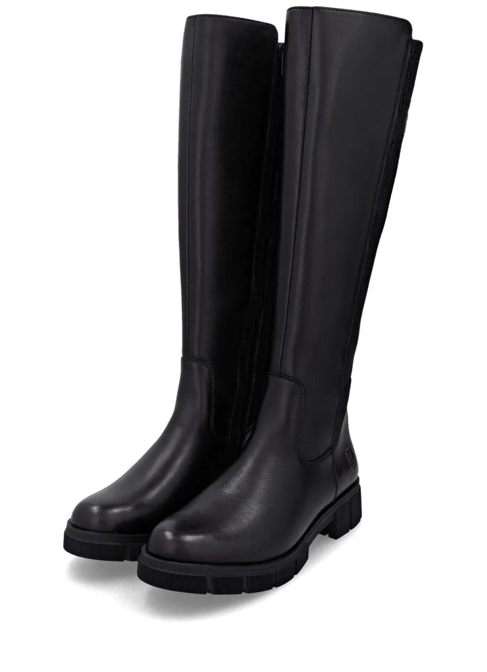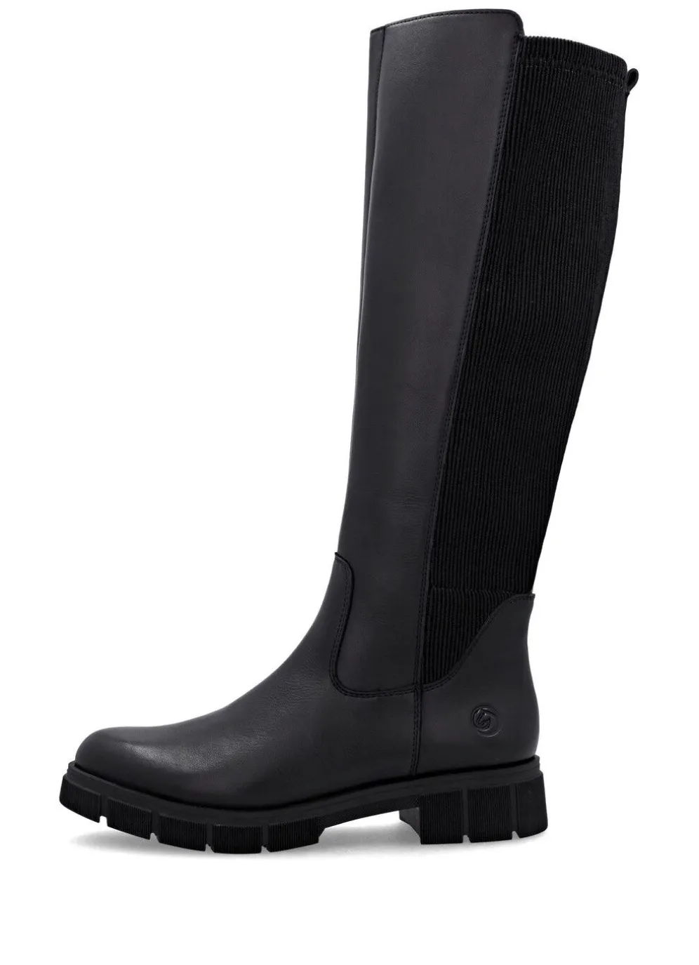 Schwarze Stiefel aus Nappaleder mit dehnbarem Schaft aus Rippstretch: Weite G, Innenreißverschluss, wärmendes Samtfutter, gepolsterte Decksohle, leichte TR-Profilsohle sowie 20 mm Absatz. Schafthöhe ca. 40 cm, Wadenweite ca. 34-38 cm