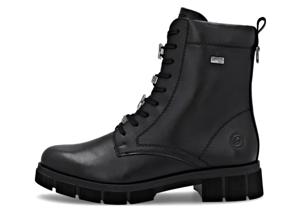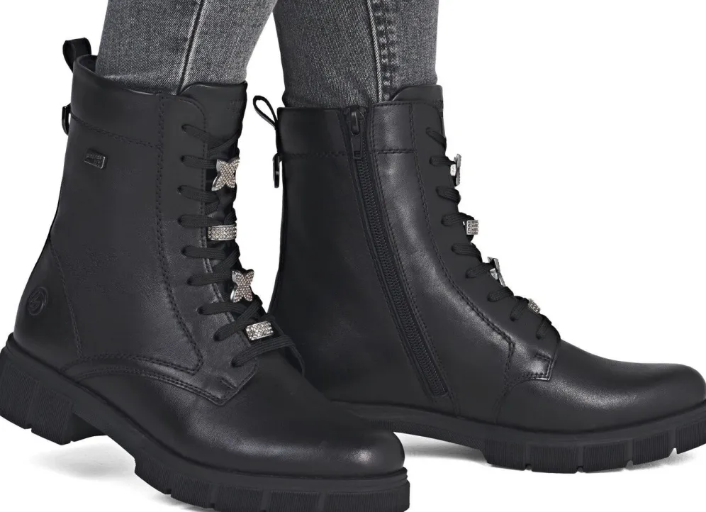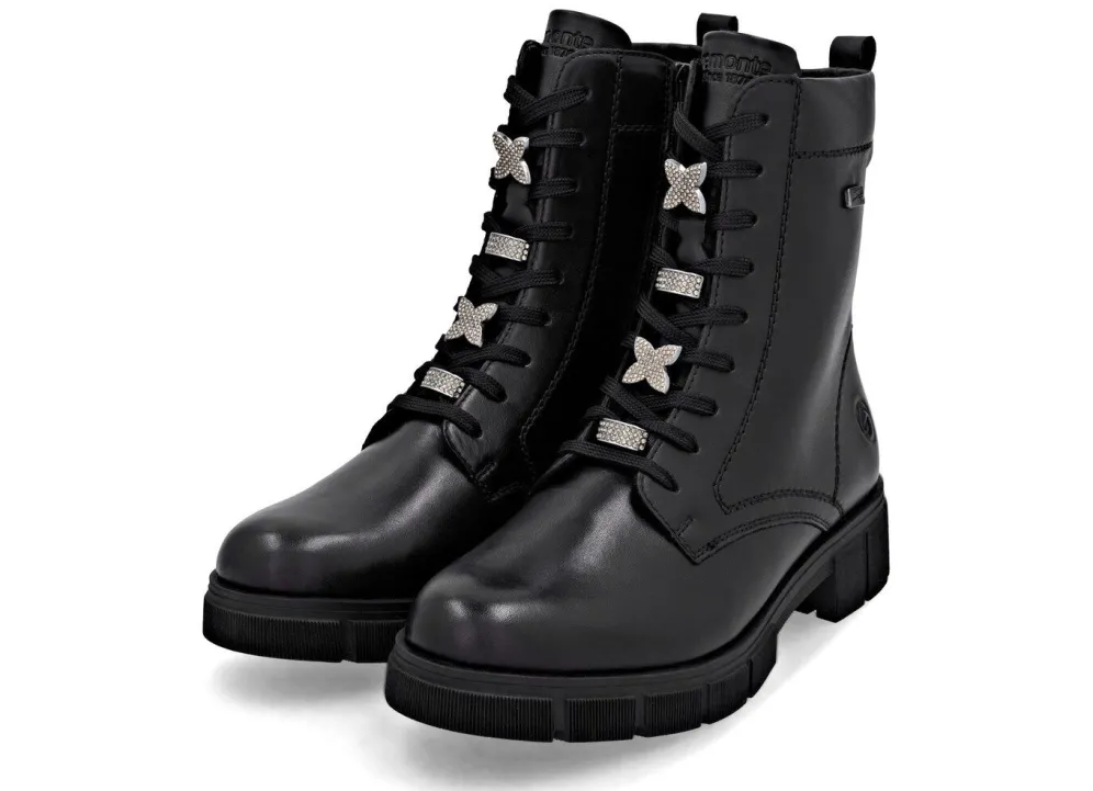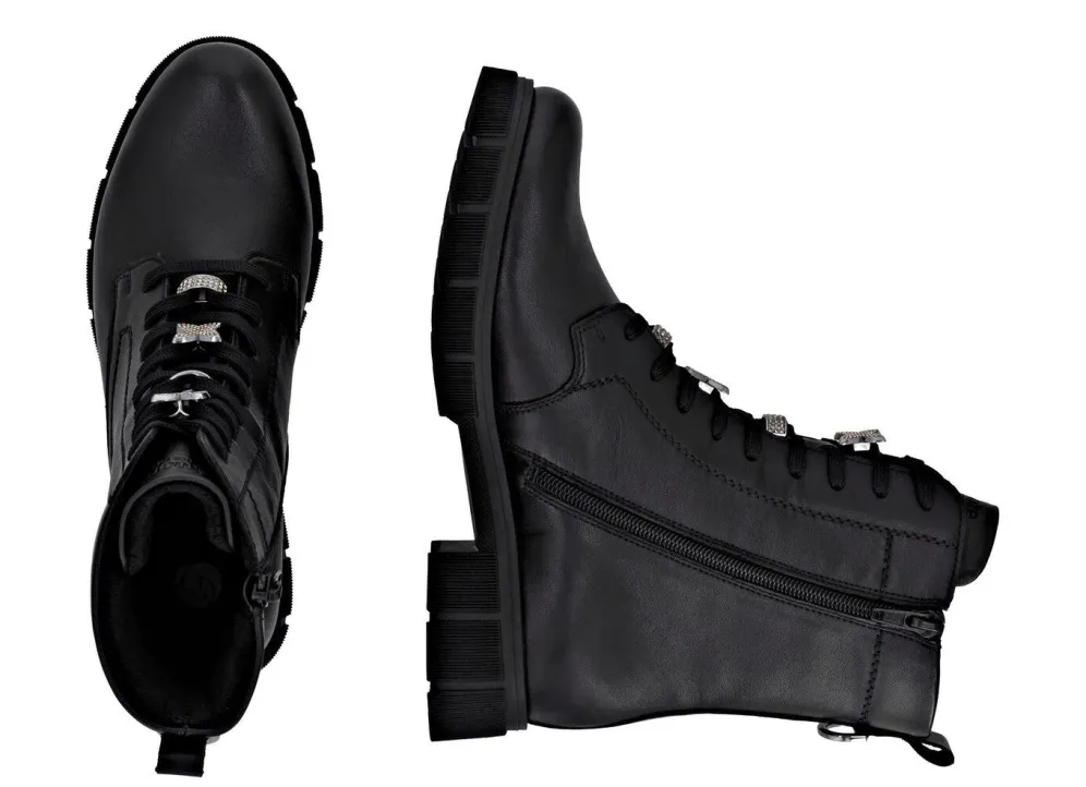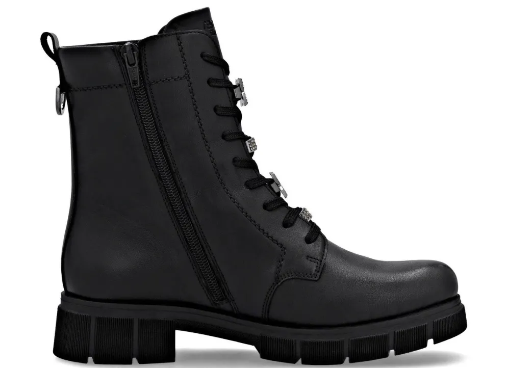 Stiefeletten aus beschichtetem Nappaleder, mit Klimamembrane ausgestattet: Weite G, Schnürung mit funkelndem Metallschmuck, Innenreißverschluss, wärmendes Plüschfutter, gepolsterte Decksohle, leichte TR-Profilsohle sowie 20 mm Absatz. Schafthöhe ca. 17 cm