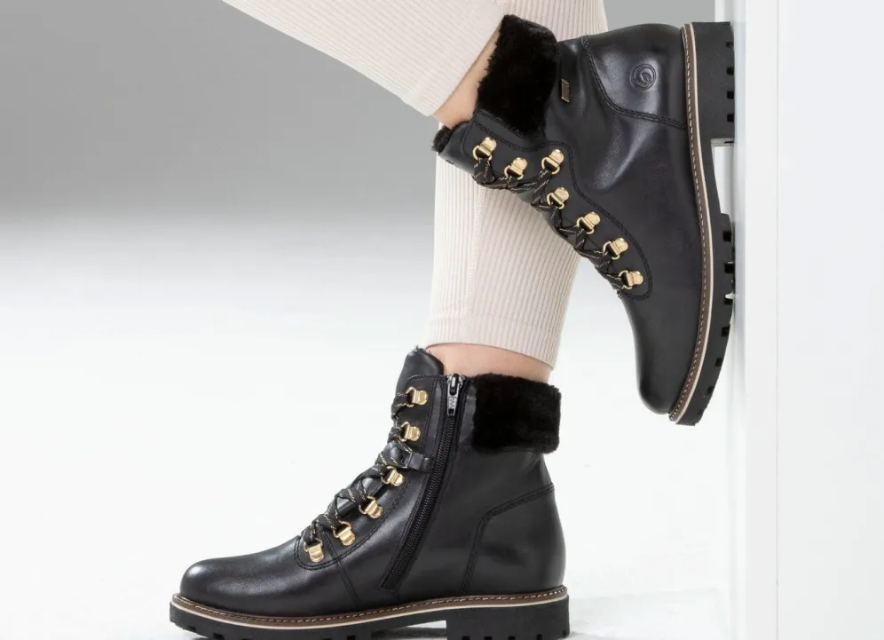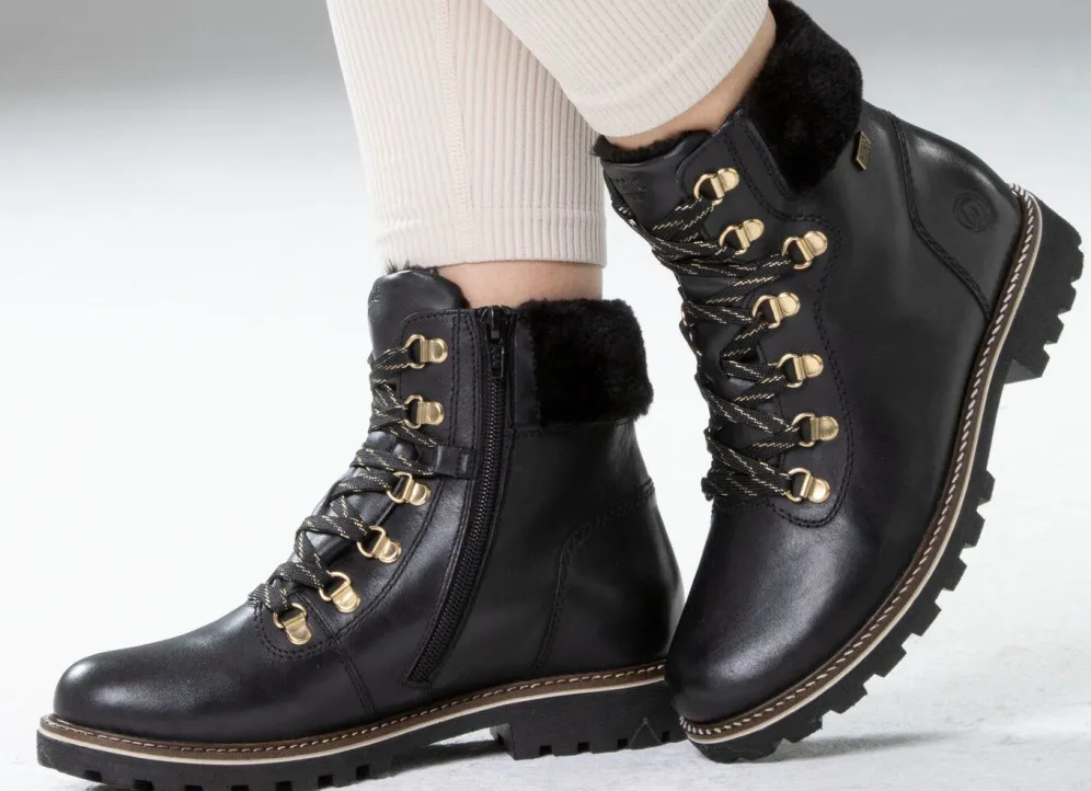 Schnür-Stiefelette aus teilweise schimmerndem Nappaleder mit Plüschkragen: mit Klimamembrane ausgestattet, praktischer Innenreißverschluss, Warmfutter und warme Decksohle, leichte TR-Profilsohle sowie 15 mm Absatz. Schafthöhe ca. 14 cm