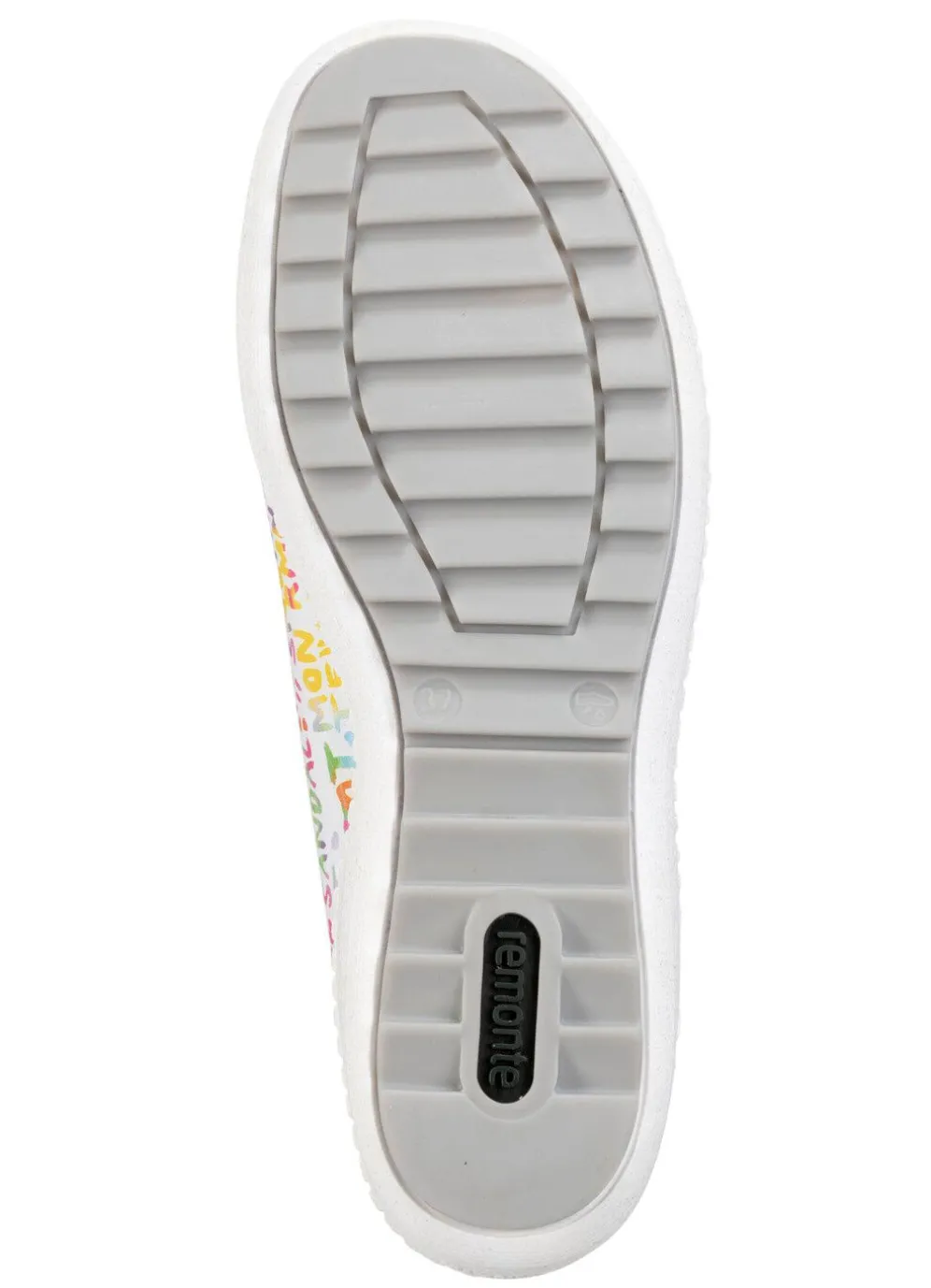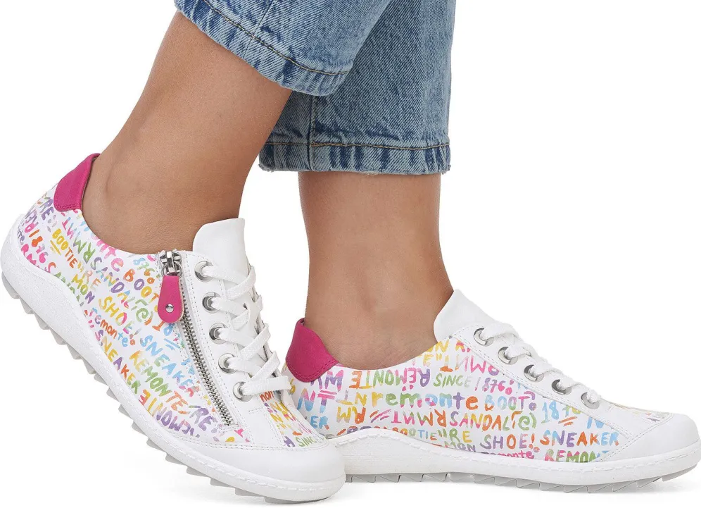 Sneaker in Weiß-Bunt, aus beschichtetem, frech bedrucktem Leder und Synthetik, mit Schnürung und seitlichem Reißverschluss: Weite G, Futter, herausnehmbare Einlage, TR-Profilsohle sowie 15 mm Keilabsatz