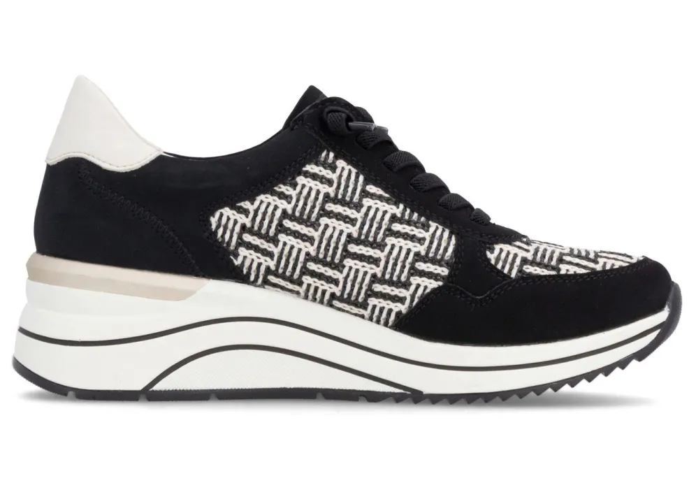 Sneaker aus teilweise schimmerndem Synthetik mit Flechtdurchzügen und elastischer Zier-Schnürung: Weite H, Futter, herausnehmbares Fußbett, leichte PU-Laufsohle sowie 30 mm Keilabsatz