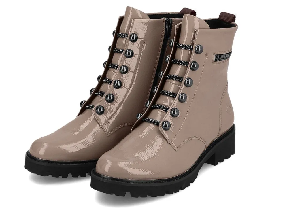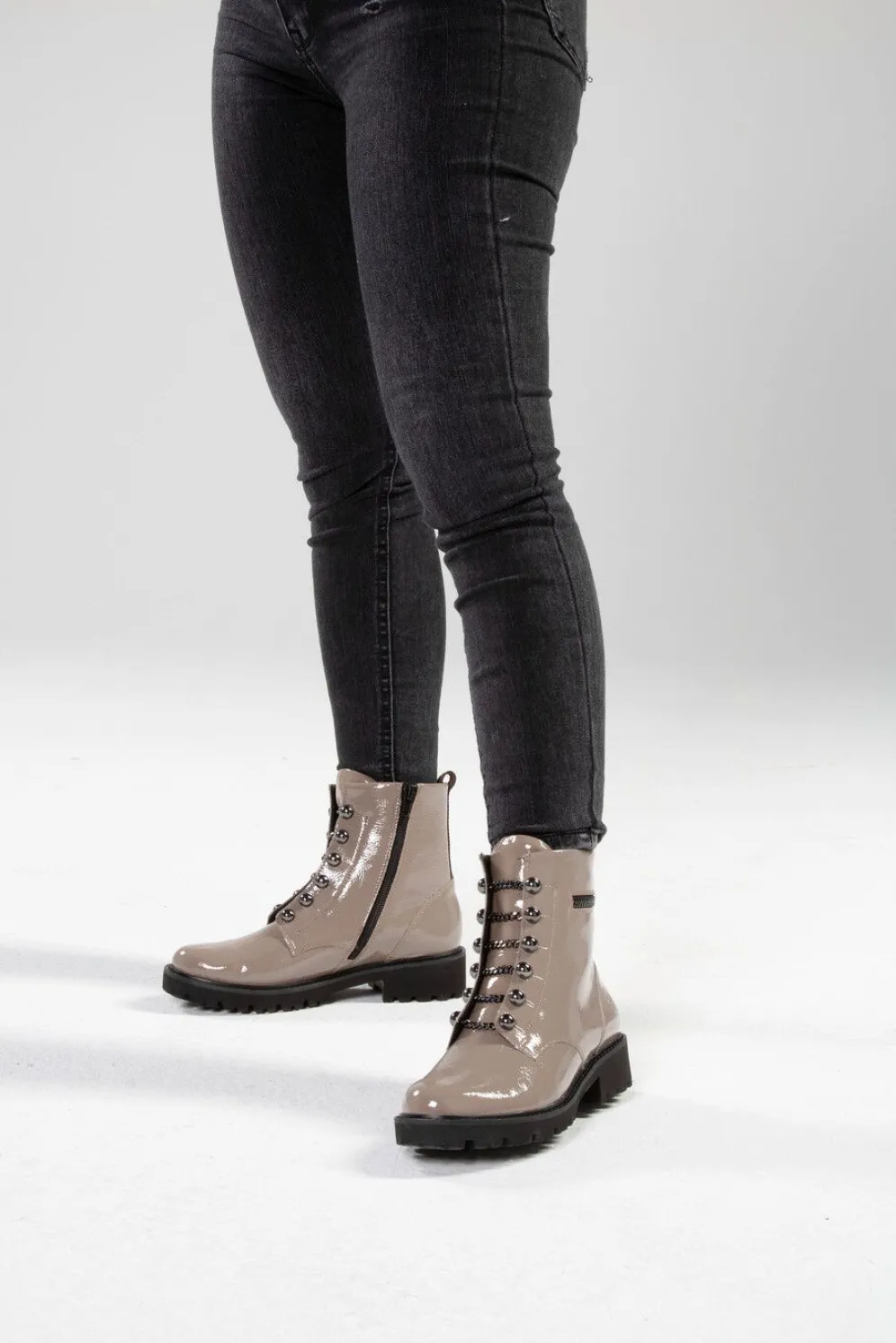 Stiefelette aus Knautschlack-Leder, in Schwarz aus feinem Nappaleder, mit trendigen Zierketten in Schnüroptik: Weite G, praktischer Innenreißverschluss, wärmendes Textilfutter, herausnehmbare Einlage, leichte EVA-Profilsohle sowie 25 mm Absatz. Schafthöhe ca. 15 cm