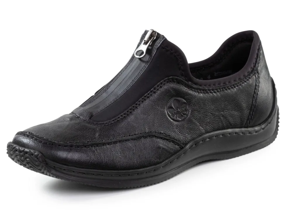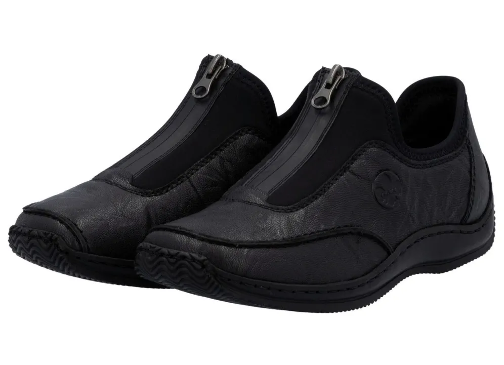 Schwarze Slipper aus genarbtem Nappaleder und dehnbarem Textilmaterial: Front-Reißverschluss, Textilfutter sowie Lederdecksohle weich gepolstert, leichte Synthetik-Riffelsohle und 10 mm Keilabsatz