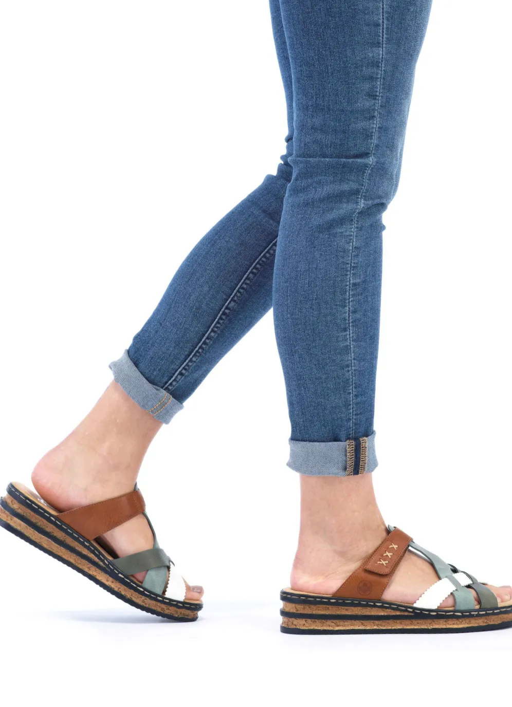 Pantoletten in Multicolor aus Synthetik mit Riemchen und verstellbarem Klettverschluss: Futter, gepolsterte Textil-Decksohle, leichte Synthetik-Riffelsohle sowie 20 mm Keilabsatz
