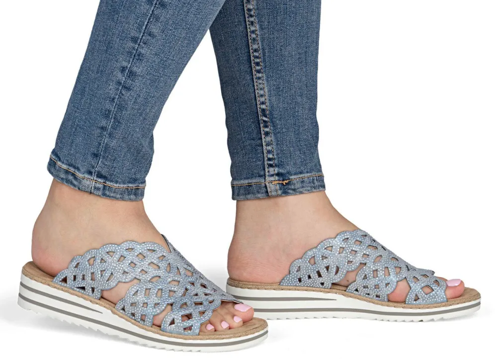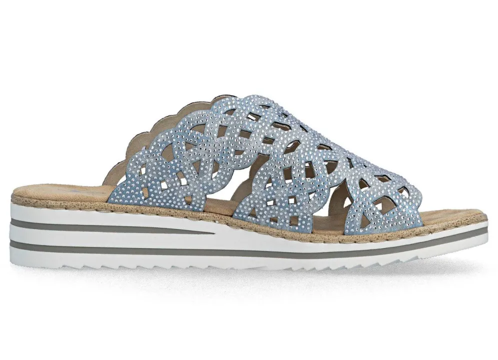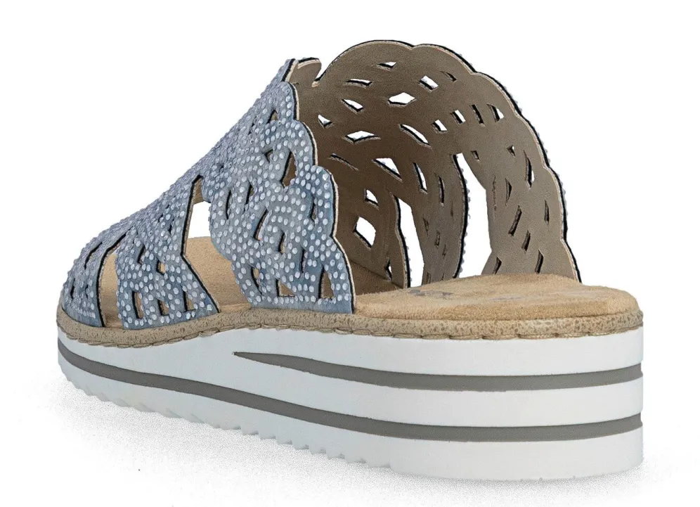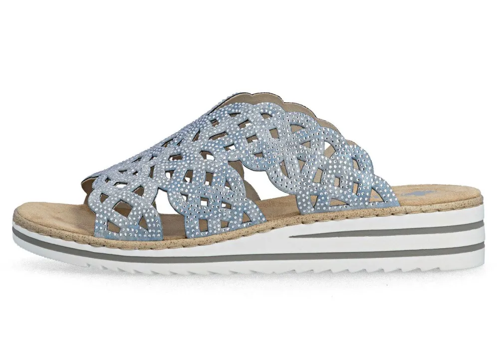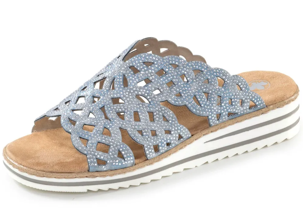 Mit Glitzersteinchen verzierte Pantoletten aus Synthetik mit luftigen Durchbrüchen: Futter, gepolsterte Decksohle, leichte Synthetik-Laufsohle sowie 20 mm Keilabsatz
