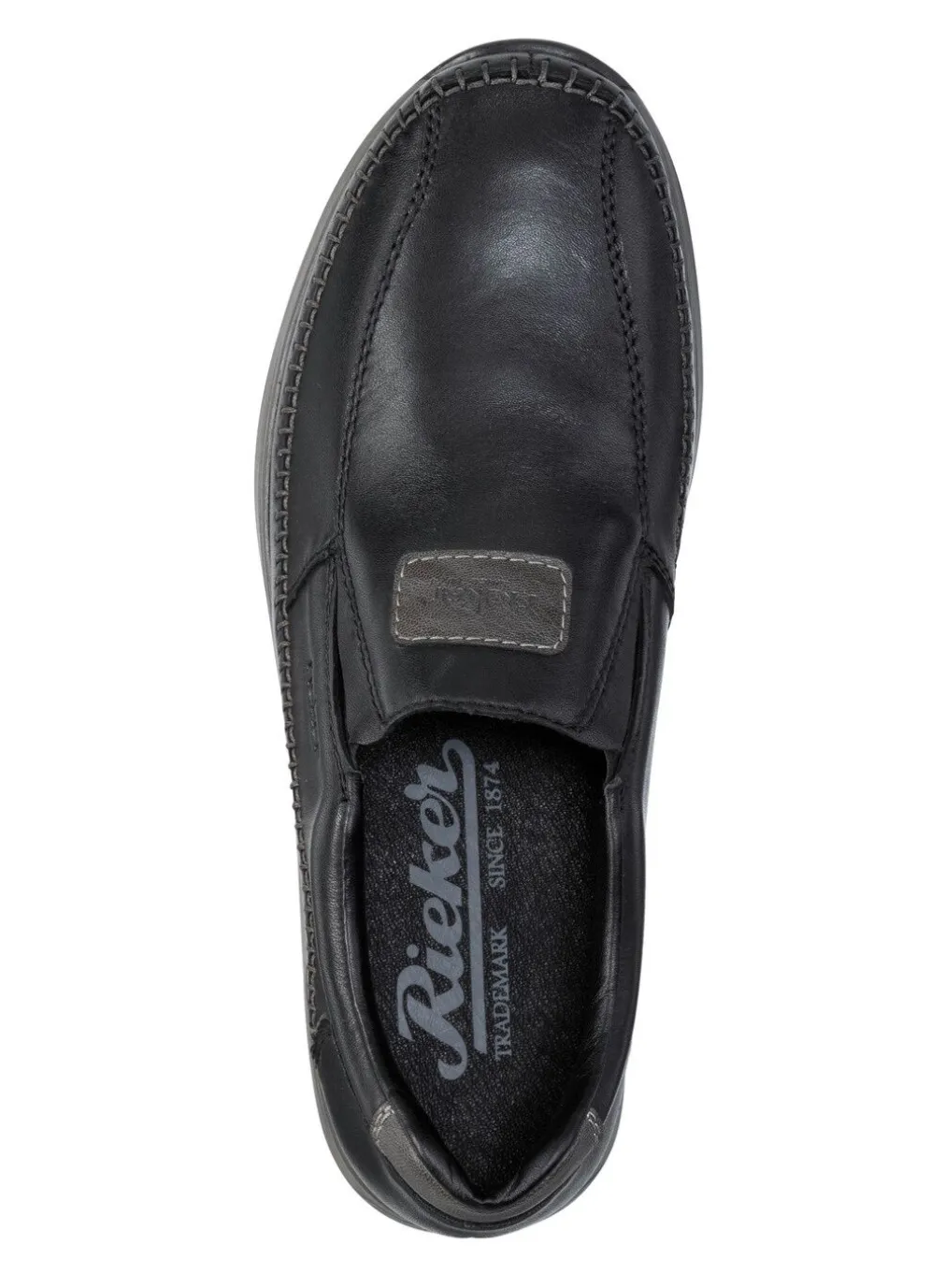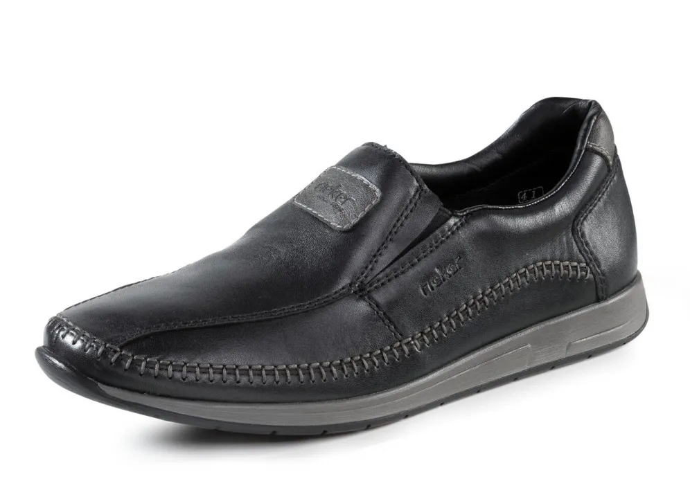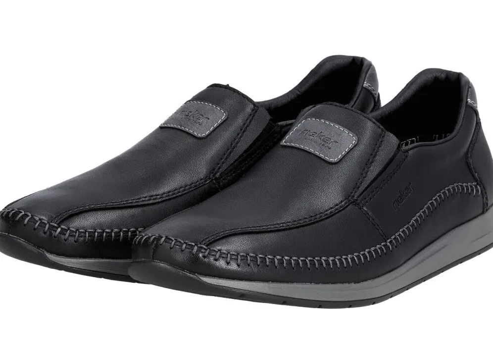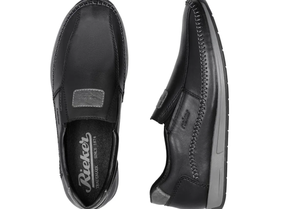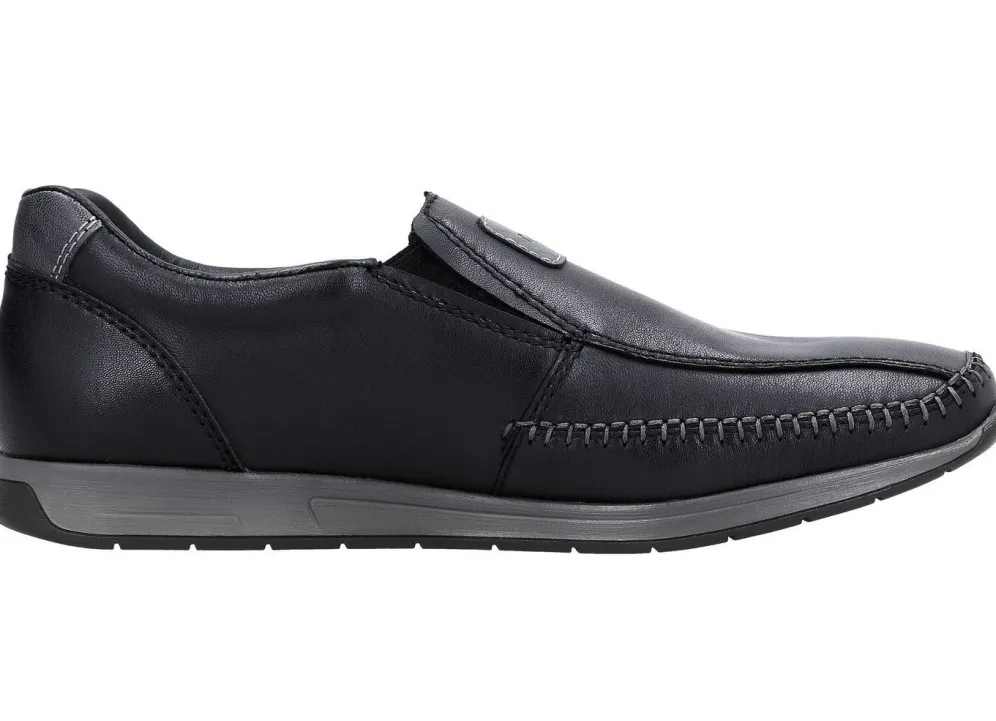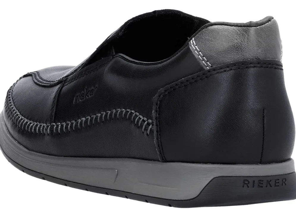 Schwarzer Slipper aus Nappaleder mit grauen Besätzen: seitliche Gummizüge, Futter, gepolsterte Lederdecksohle sowie superleichte Synthetik-Profilsohle