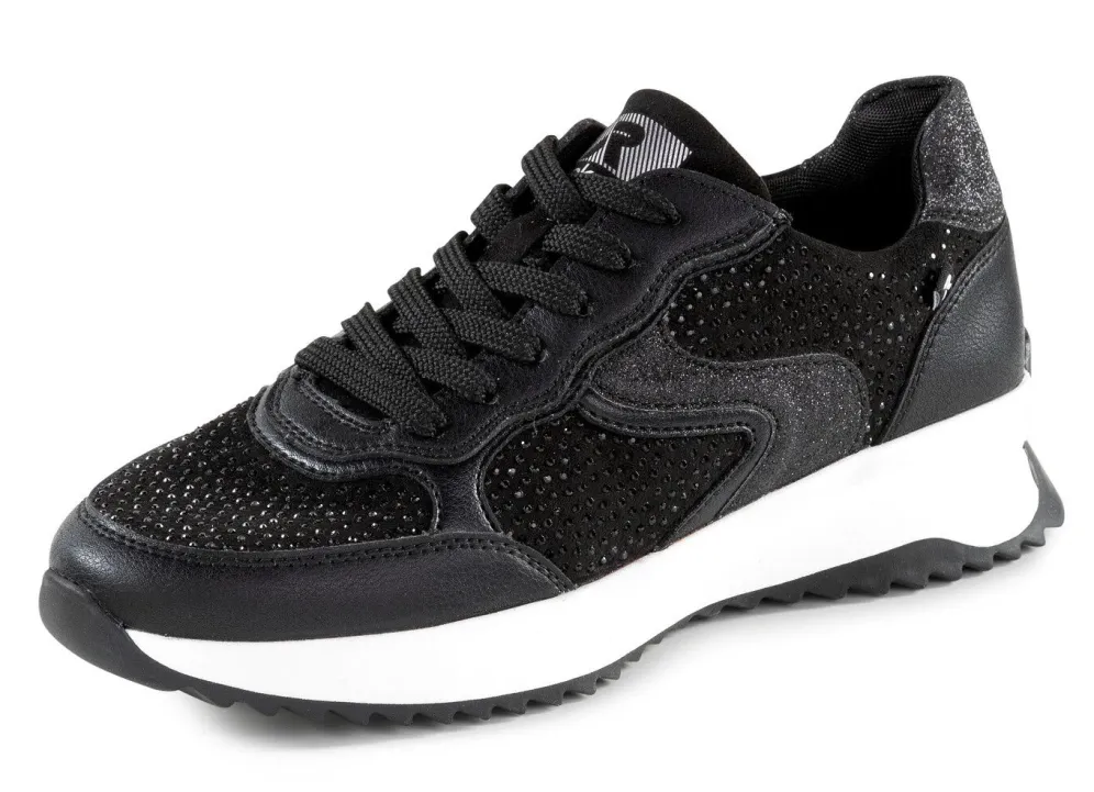 Mit Glitzersteinchen verzierter Sneaker aus Synthetik und teilweise schimmernd geprägtem Leder: Weite G, Schnürung, Textilfutter, herausnehmbares Fußbett, leichte TR-Profilsohle sowie 20 mm Keilabsatz
