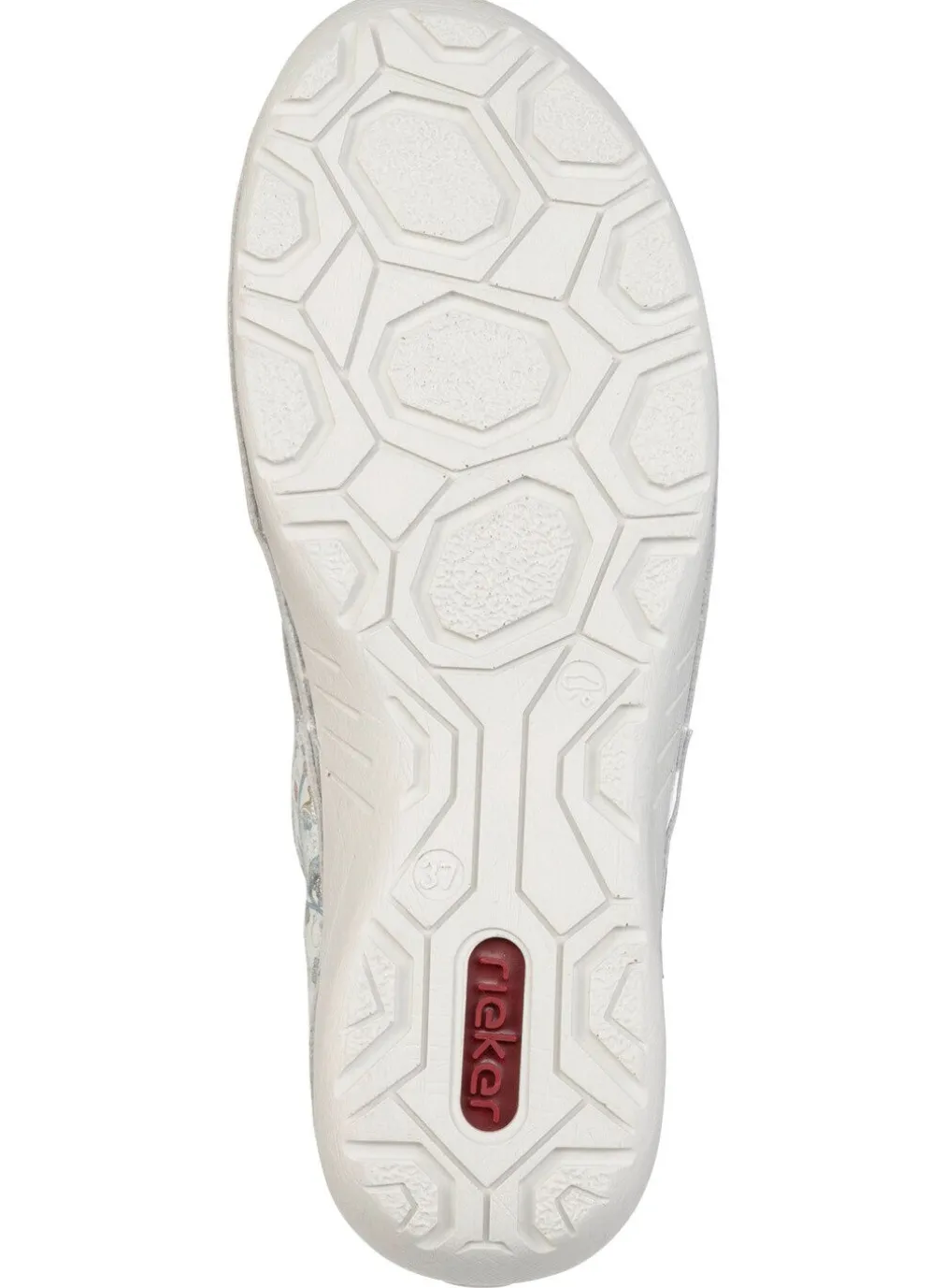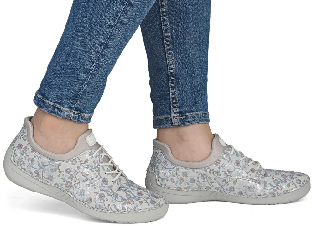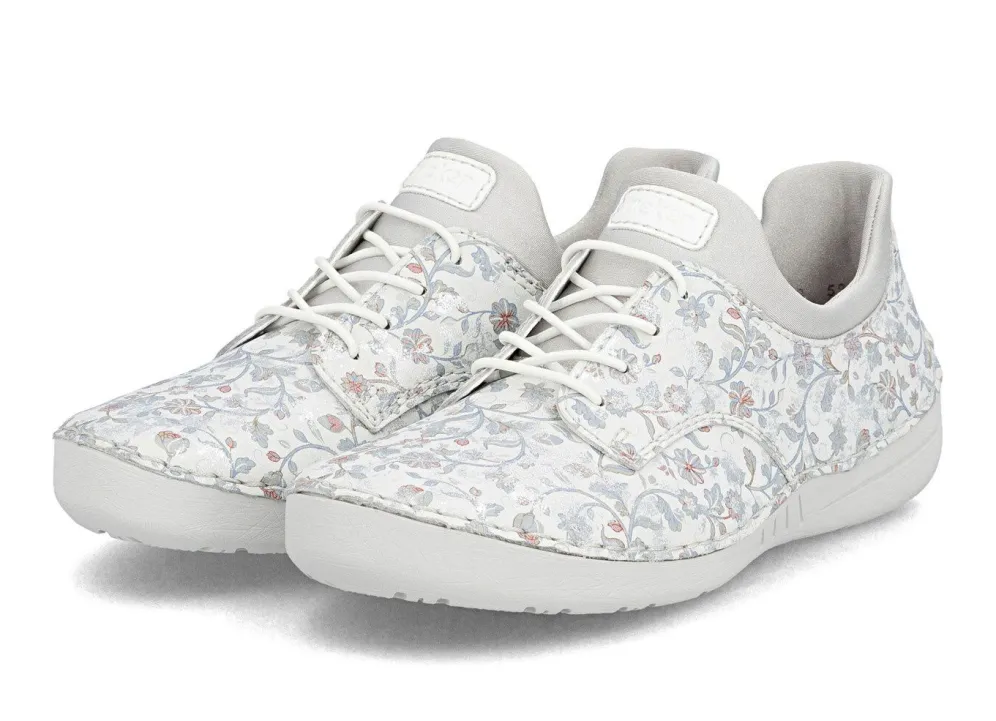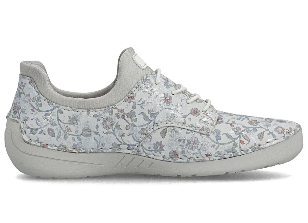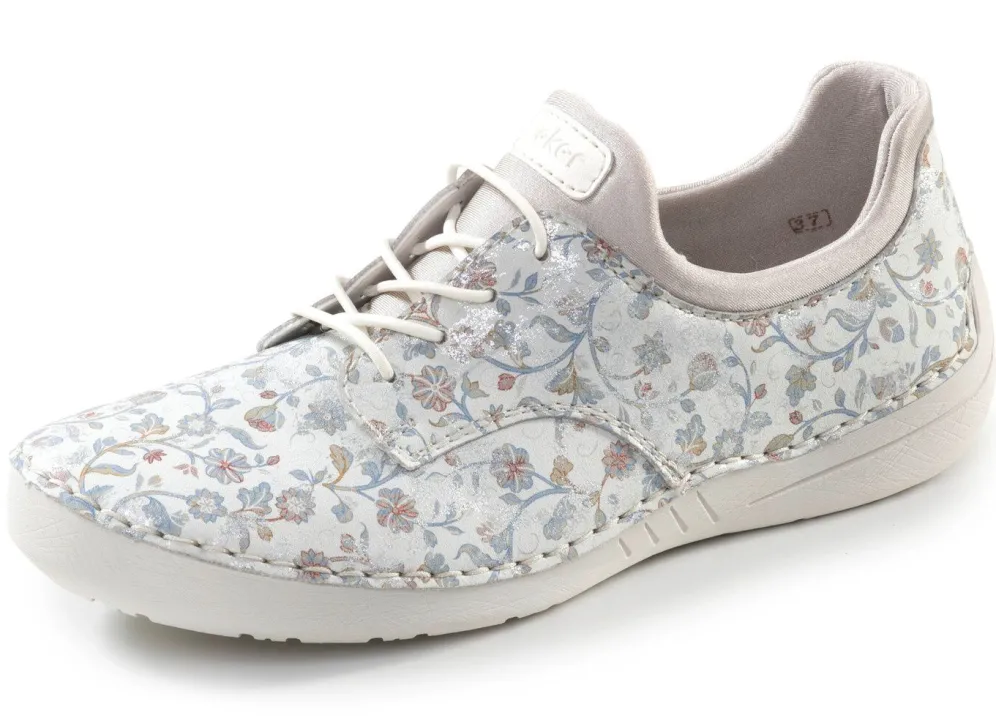 Sneaker aus floral bedrucktem Synthetik und zart glänzendem Textil: elastische Zierschnürung, Textilfutter, gepolsterte Decksohle, leichte Synthetik-Laufsohle sowie 15 mm Keilabsatz