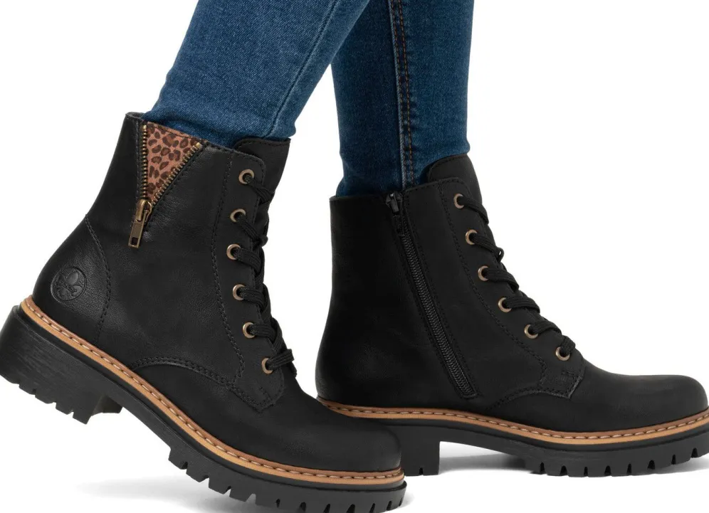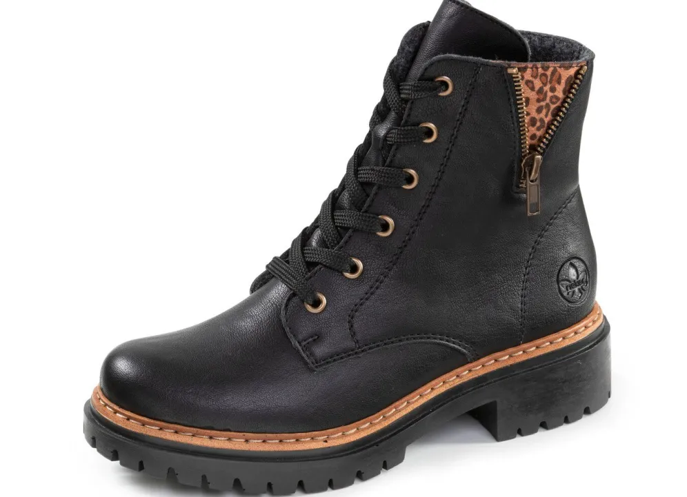 Stiefeletten aus weichem Synthetik mit Leo-Detail, in Beige-Schwarz aus kariertem Textilmaterial mit schimmernden Metallic-Durchzügen: Zier-Reißverschluss, Schnürung und Innenreißverschluss, wärmendes Textilfutter, gepolsterte Decksohle, leichte Synthetik-Profilsohle sowie 20 mm Absatz. Schafthöhe ca. 14 cm