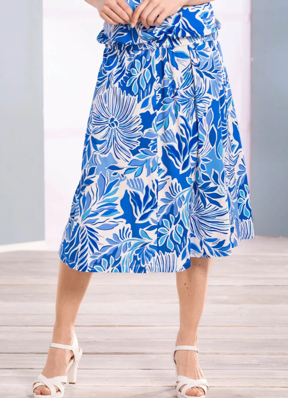 Bezaubernder, marine-weiß-türkisfarbener Rock in weit ausgestellter Form, mit elastischem Bund rundum sowie Gürtelschlaufen.