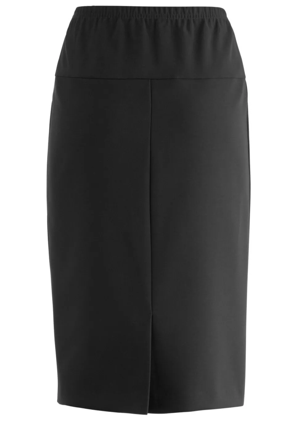 Kombifreundlicher Rock in gerader Schnittführung: Dehnbund rundum, figurgünstige breite Passe sowie verdeckter Gehschlitz im Rückteil. Länge ab Taille ca. 62 cm, ab Gr. 44 ca. 65 cm. Ungefüttert.