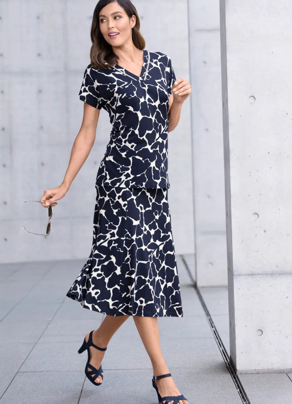 Jedes Teil ein Unikat! Mit sportivem Chic präsentiert sich dieser tragangenehme, marine-ecrufarbene Bahnenrock in schicker A-Linie: bequeme Schlupfform, glatt anliegend dank des innen liegenden, unsichtbaren Rundum-Dehnbundes, nach unten hin in leicht ausgestellter Form.