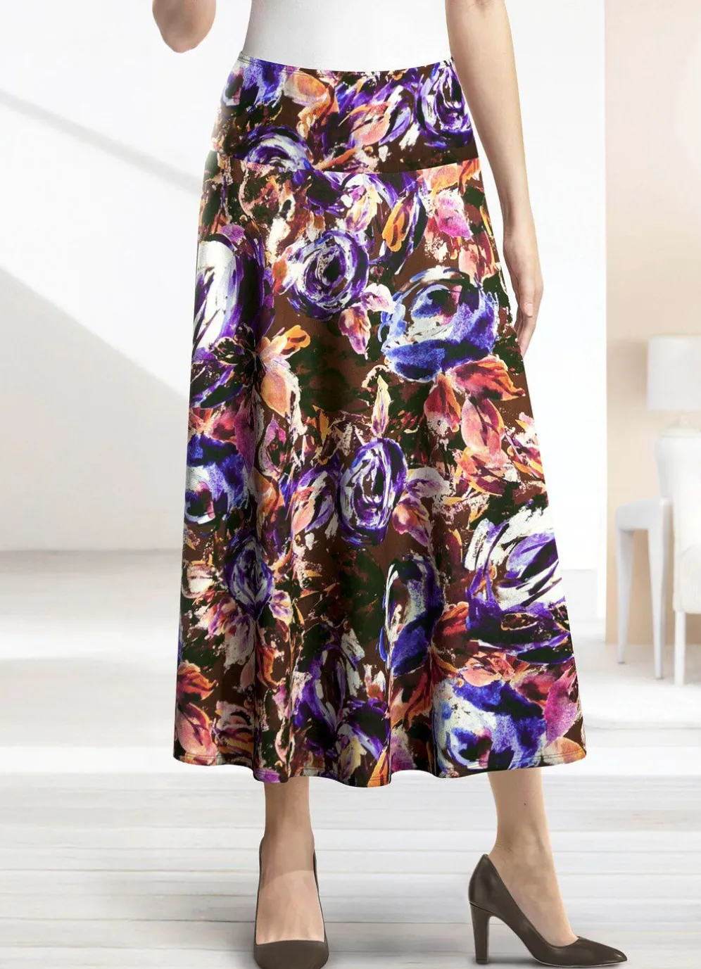 Jedes Teil ein Unikat! Ausdrucksstark dessinierter Rock in Braun-Bunt: figurgünstige, breite Passe rundum sowie bequeme Schlupfform mit schmalem Dehnbund rundum. Die leichte Tellerform verleiht diesem Modell seine duftige Weite. Gesamtlänge ca. 78 cm, bei K-Gr. ca. 72 cm.
