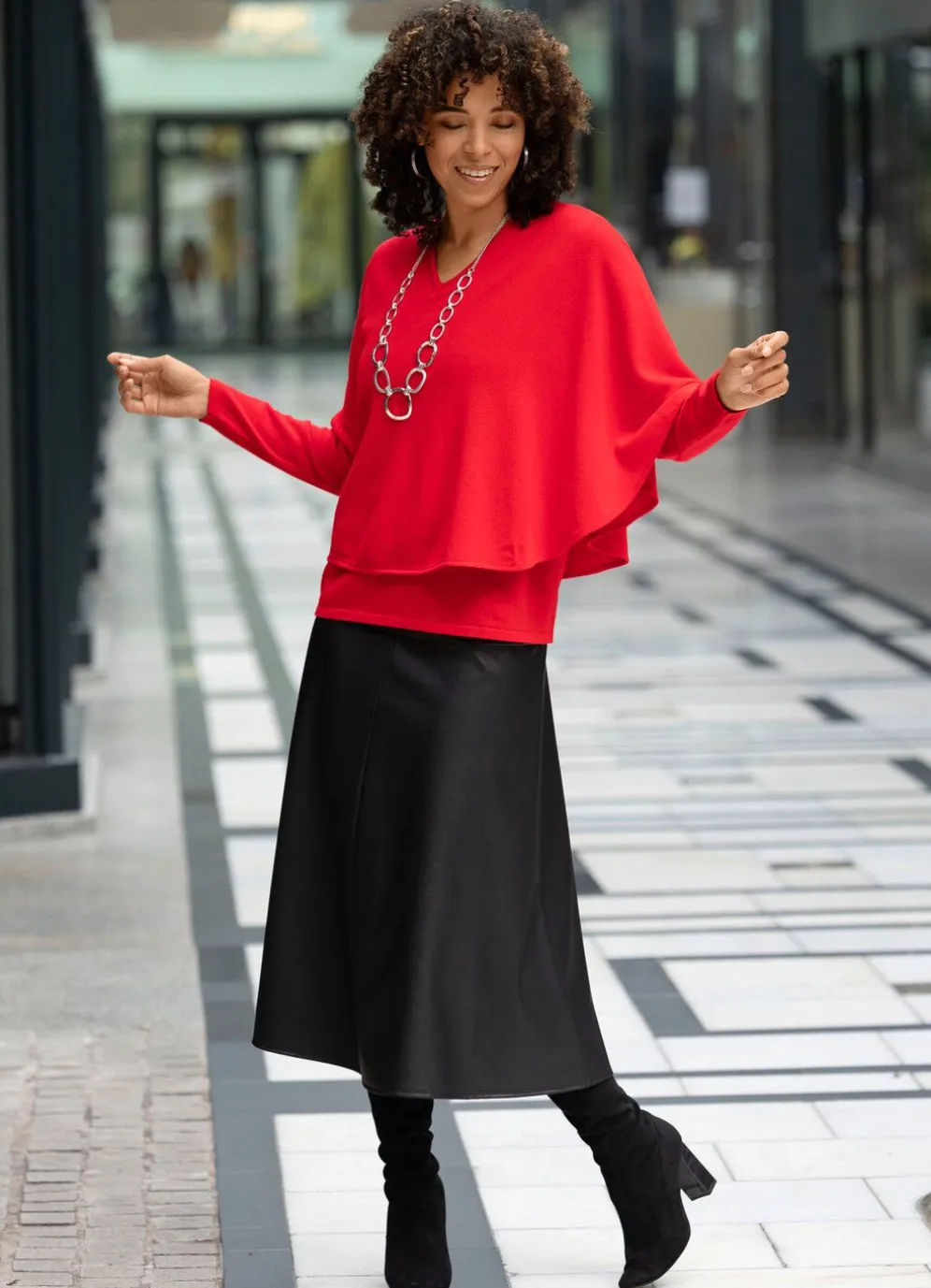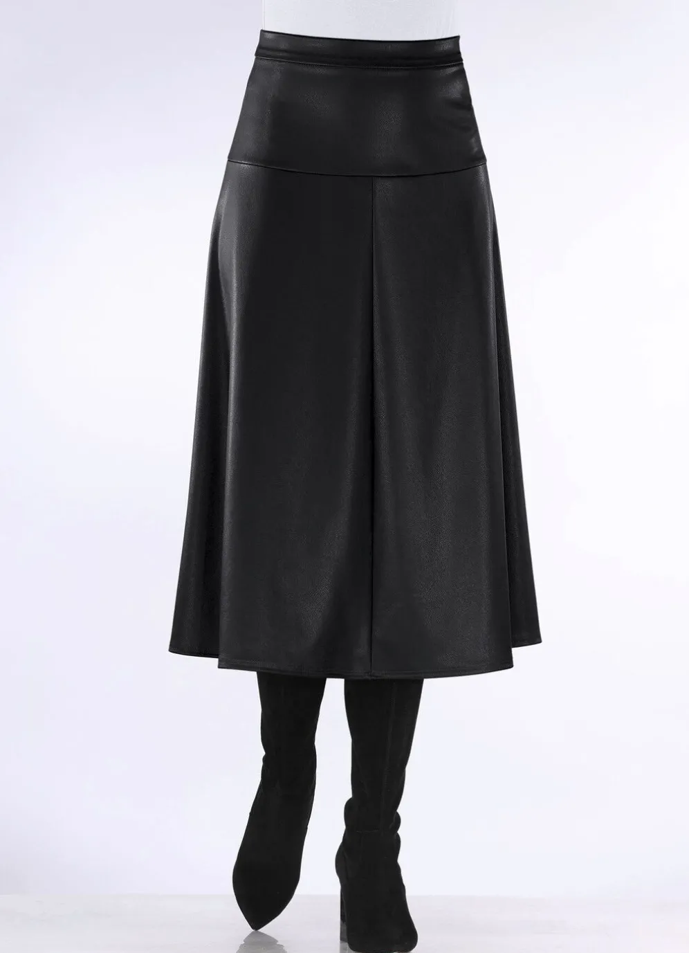 Voll im Trend liegt dieser tragangenehme Rock aus softem Nappaleder-Imitat in bequemer Schlupfform, glatt anliegend dank des innenliegenden, unsichtbaren Rundum-Dehnbundes, figurgünstige, breite Passe rundum sowie Teilungsnähte im Vorder- und Rückteil. Die leichte Tellerform verleiht diesem Modell seine schwingende Weite. Länge ab Taille ca. 78 cm, bei K-Gr. ca. 74 cm.