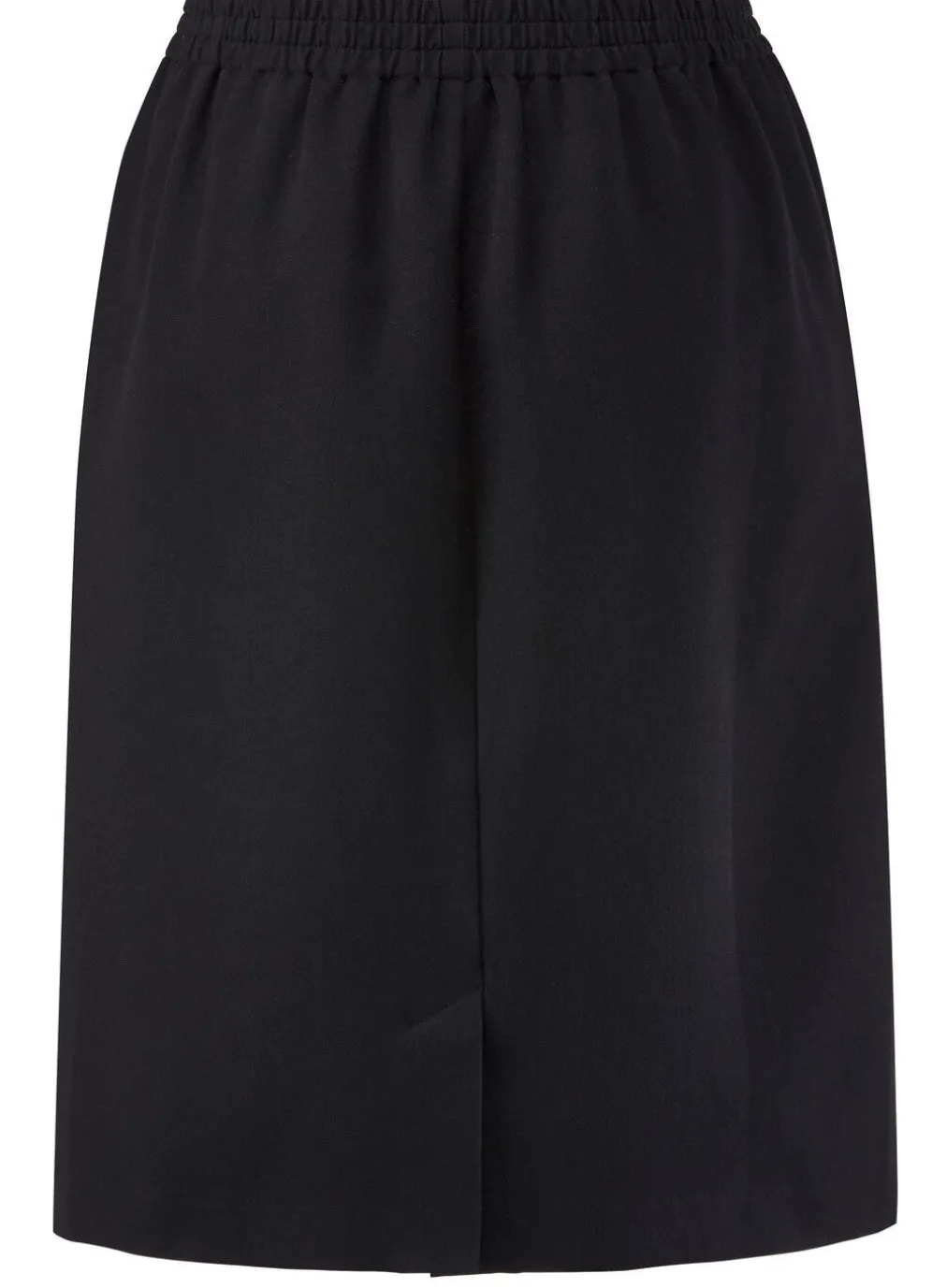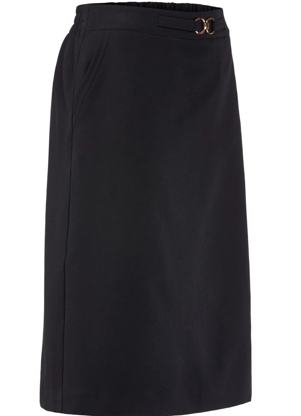 Femininer Rock in schmaler Schnittführung und Schlupfform: rückwärtiger Dehnbund-Einsatz, schmückendes Zierteil vorne am Bund, Seitentaschen sowie verdeckter Gehschlitz im Rückteil. Gesamtlänge ca. 61 cm, ab Gr. 44 ca. 64 cm, ab Gr. 50 ca. 67 cm.