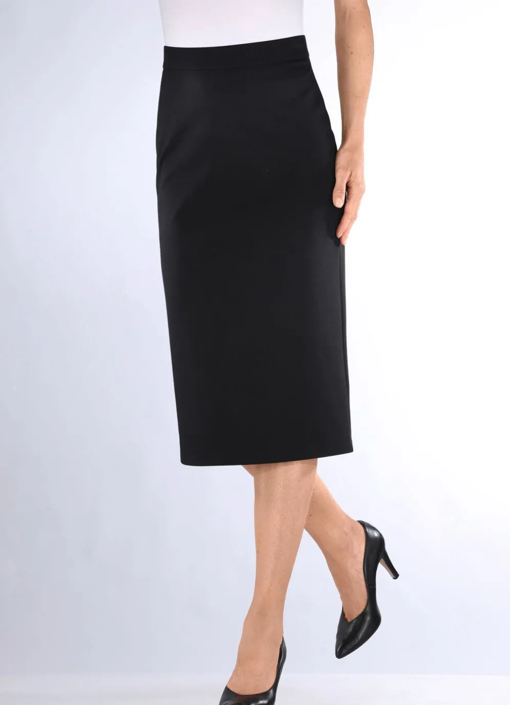 Eleganter Rock in schmaler Schnittführung und in Schlupfform sowie mit glatt anliegendem Rundum-Dehnbund. Länge ab Taille ca. 66 cm, bei K-Gr. ca. 62 cm.