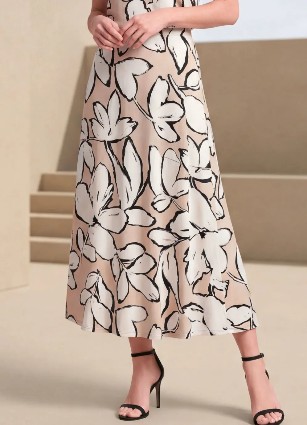 Jedes Teil in Unikat! Mit farbbrillantem Druck in Taupe-Ecru-Schwarz zeigt sich dieser weit schwingende Rock mit Passen vorne und hinten sowie elastischem Dehnbund rundum.