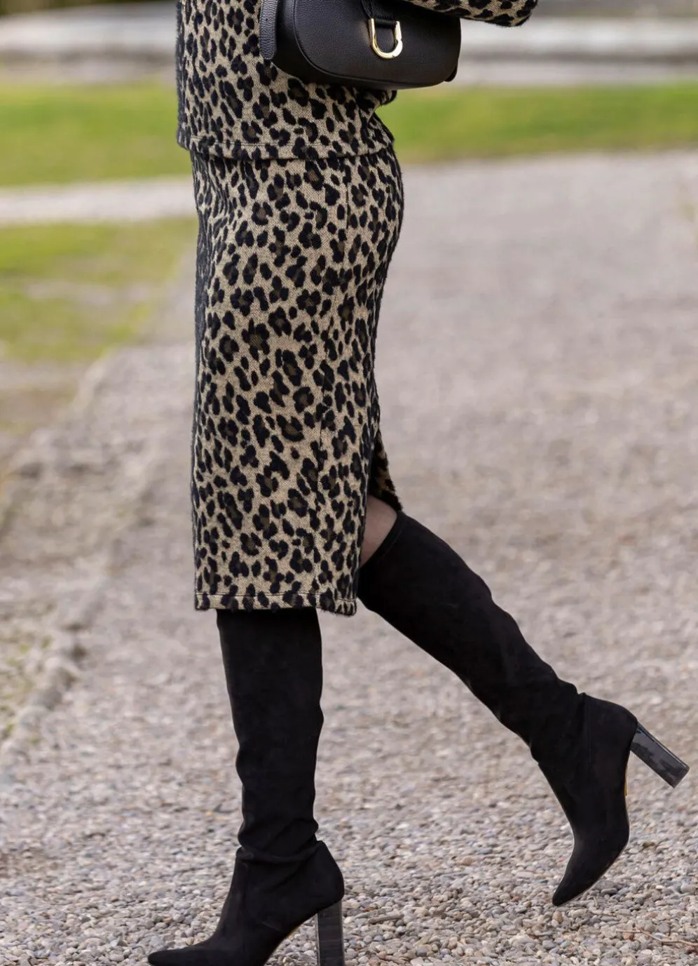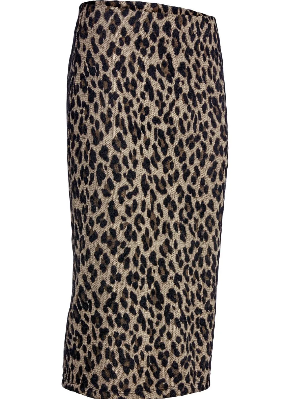 Eleganter Rock in Strick-Optik und schmaler Schnittführung: Schlupfform sowie mit glatt anliegendem Rundum-Dehnbund, Teilungsnaht sowie verdeckter Gehschlitz im Rückteil. Gesamtlänge ca. 74 cm, bei K-Gr. ca. 70 cm.
