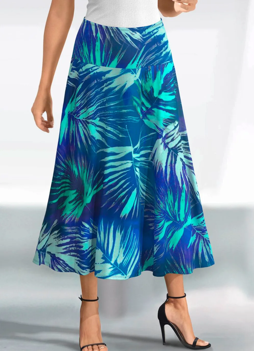 Jedes Teil ein Unikat! Ausdrucksstark dessinierter Rock in Royalblau-Mint: figurgünstige, breite Passe rundum sowie bequeme Schlupfform mit schmalem Dehnbund rundum. Die leichte Tellerform verleiht diesem Modell seine duftige Weite. Gesamtlänge ca. 80 cm, bei K-Gr. ca. 74 cm.