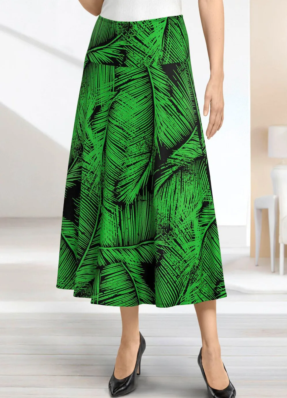 Jedes Teil ein Unikat! Wunderschöner, ausdrucksstark dessinierter Rock im farbbrillanten Druck in Schwarz-Grün: figurgünstige, breite Passe rundum sowie bequeme Schlupfform mit schmalem Dehnbund rundum. Die leichte Tellerform verleiht diesem Modell seine duftige Weite. Gesamtlänge ca. 78 cm.