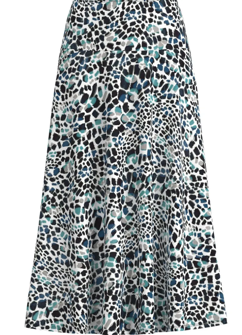 Jedes Teil ein Unikat! Wunderschöner, ausdrucksstark dessinierter Rock im farbbrillanten Druck in Ecru-Schwarz-Bunt: figurgünstige, breite Passe rundum sowie bequeme Schlupfform mit schmalem Dehnbund rundum. Die leichte Tellerform verleiht diesem Modell seine duftige Weite. Gesamtlänge ca. 78 cm.